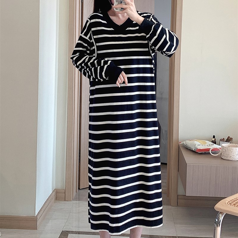 孕产妇春秋哺乳纯棉条纹加长睡裙加大码 200斤产后月Y子怀孕连衣裙