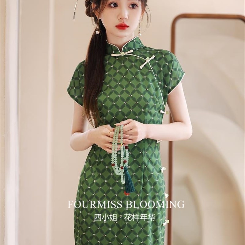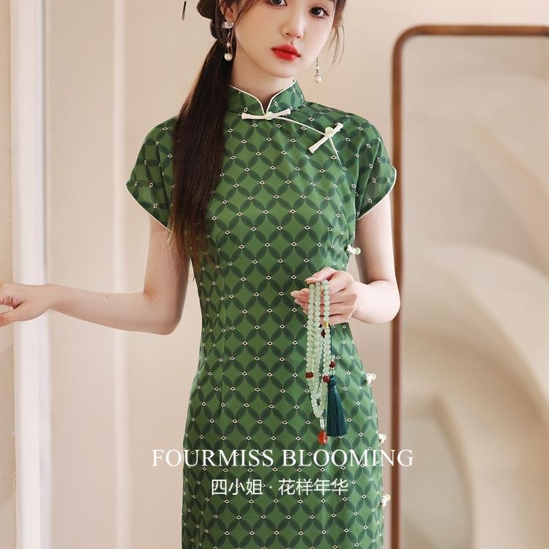 走秀旗袍2025新款 显瘦礼仪形体表演服绿意盎然 旗袍走秀演出服短袖