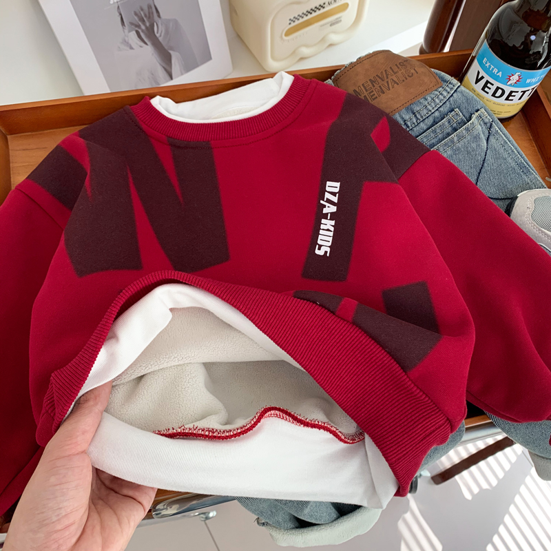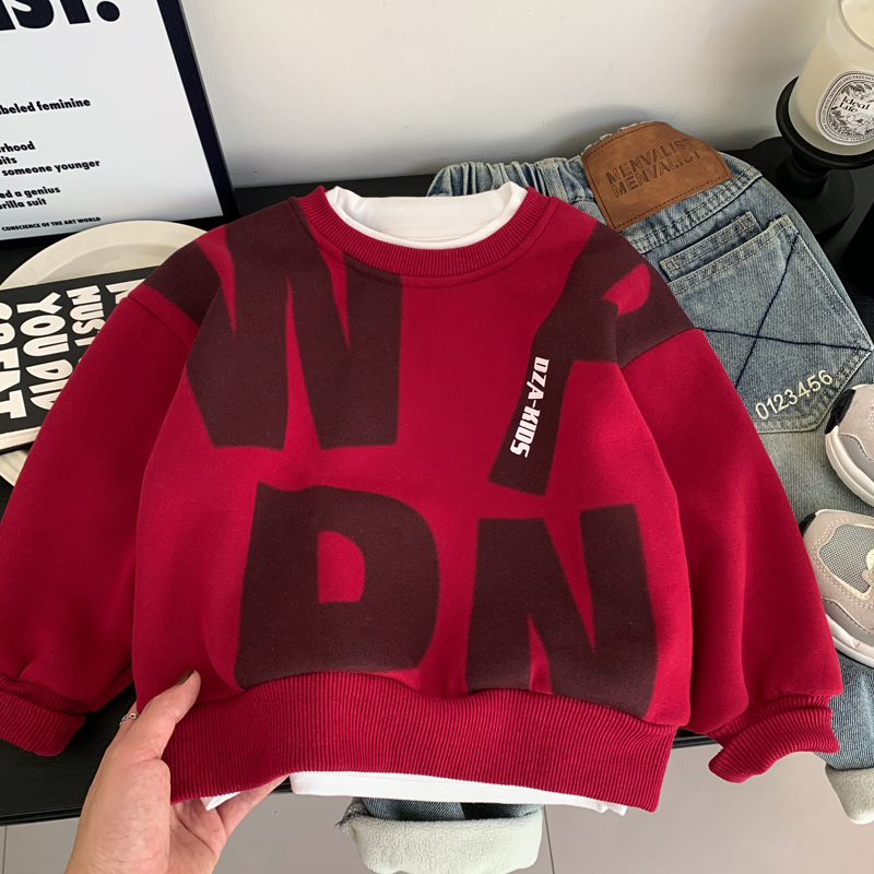 字母加绒上衣酷帅中小童假两件套头衫 男童红色卫衣秋冬装 儿童韩版