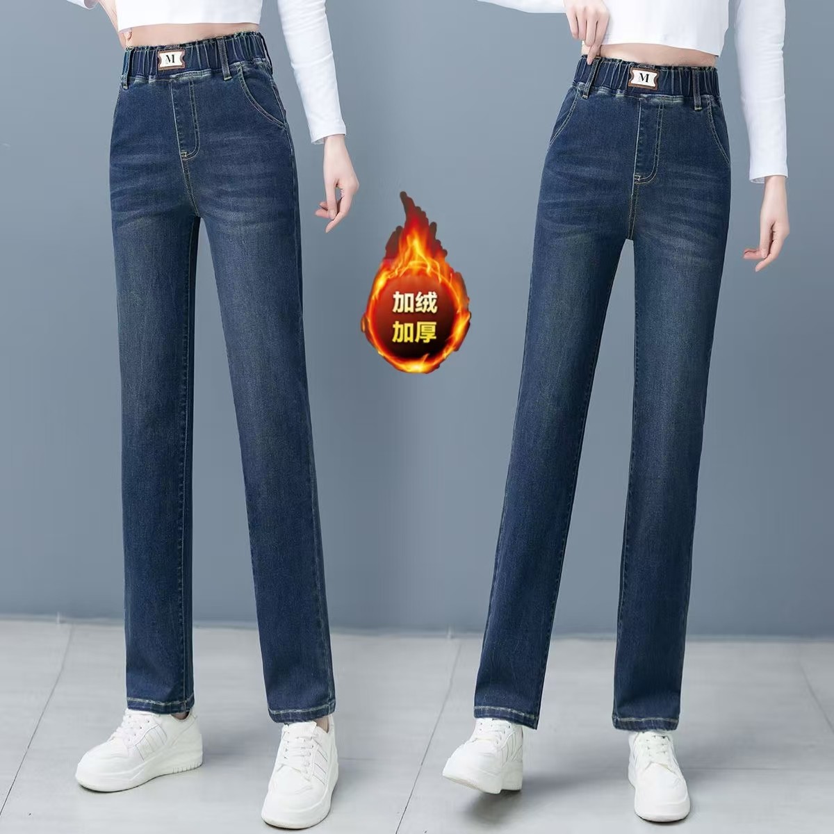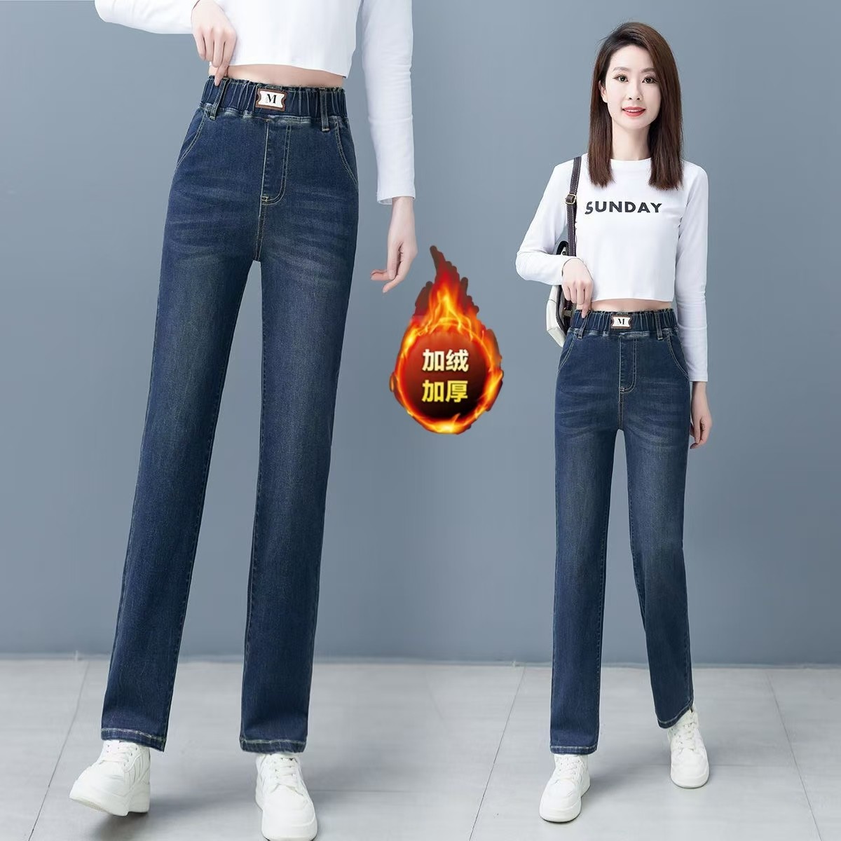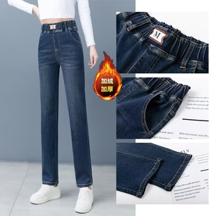 高腰宽松显瘦裤 女秋冬弹力2025新款 加绒加厚直筒牛仔裤 松紧腰单裤