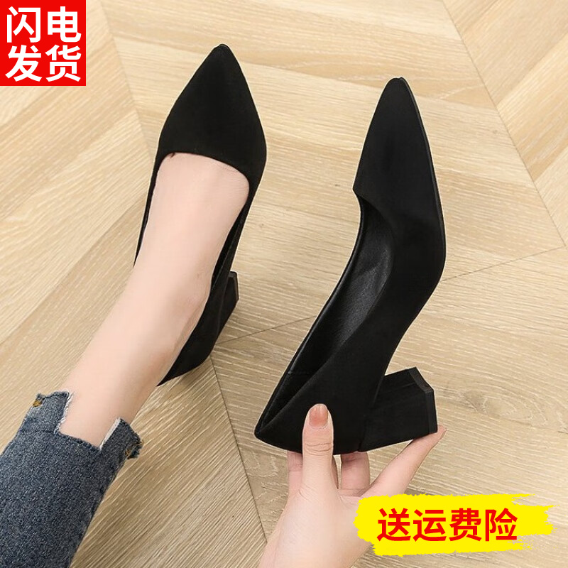 宽脚羊皮尖头舒适通勤浅口单鞋 大码 黑松露 秋冬女鞋 7or9黑色高跟鞋