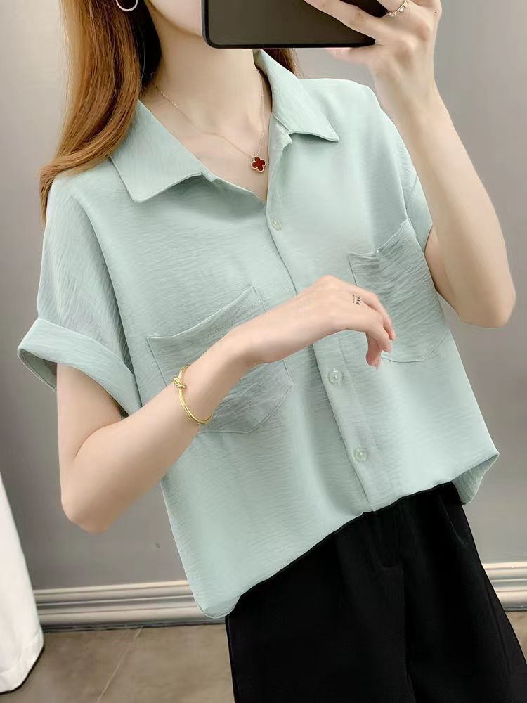 女短袖 百搭小衫 夏季 女装 设计感小众衬衣宽松遮肉上衣大码 雪纺衬衫