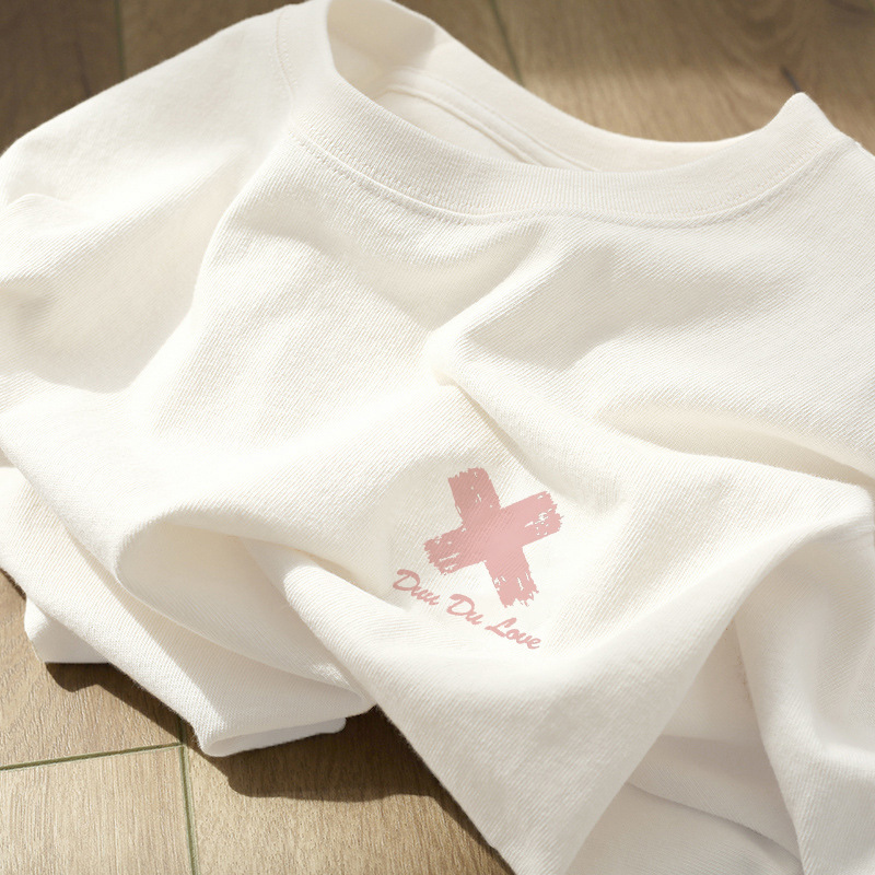 女装 白色仿棉短袖 复古宽松小众设计高级感大码 美式 上衣 t恤女夏季