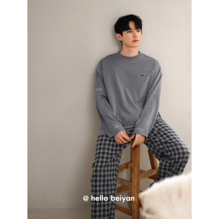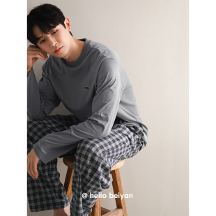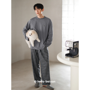 宽松套装 贝妍睡衣春秋季 格子长裤 柔软棉家居服圆领套头长袖 男新款