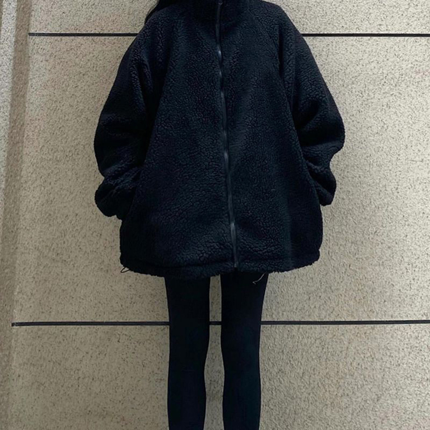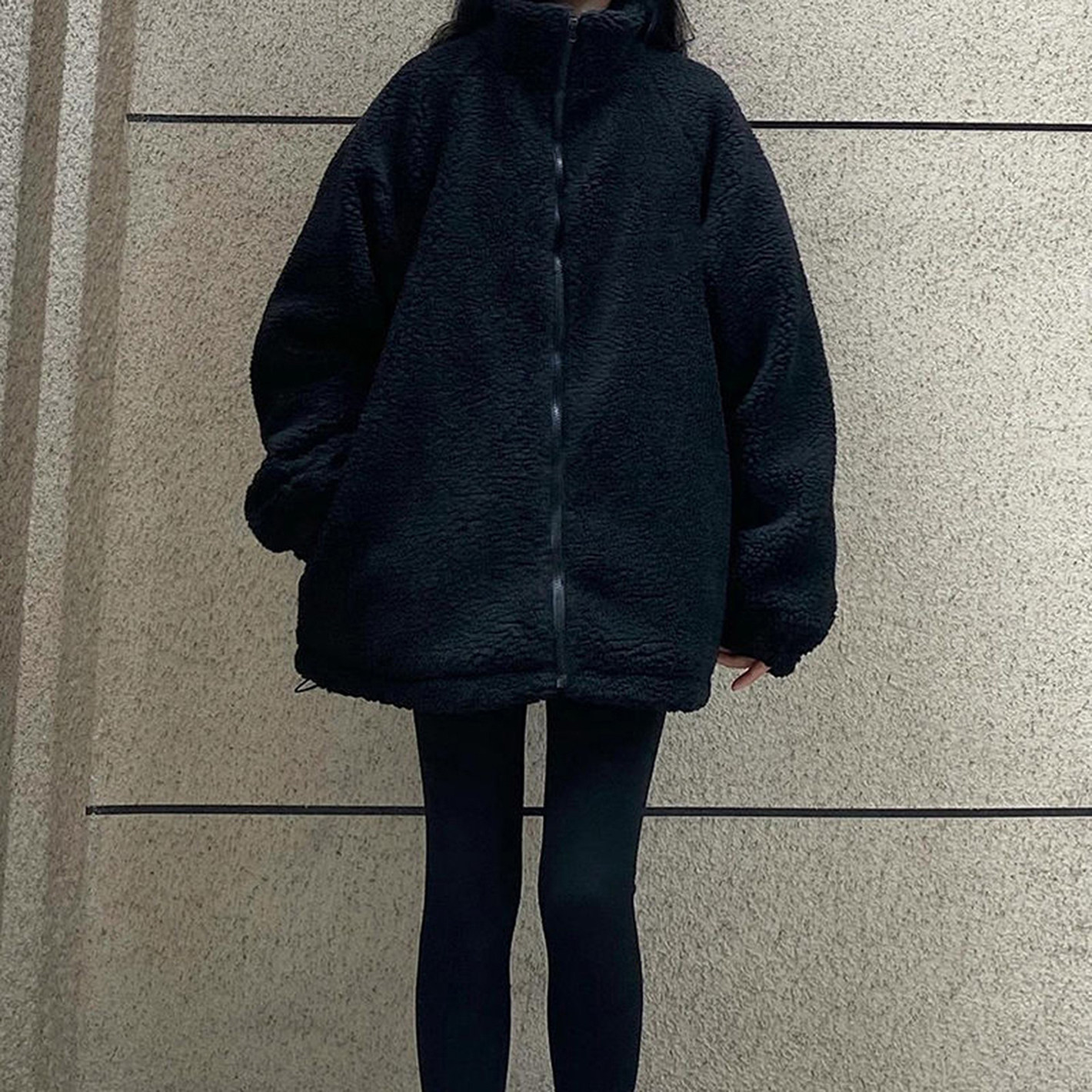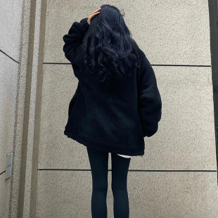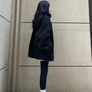 2025秋冬新款 纯黑色加绒加厚外套女宽松立领休闲情侣羊羔毛外套男