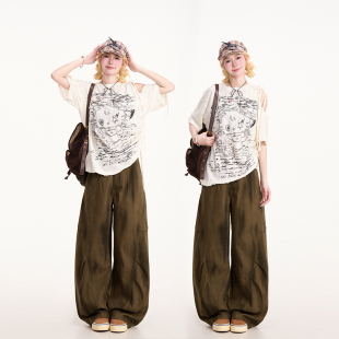 NERESUM复古Kitty猫露肩短袖 设计感抽绳宽松小众上衣 T恤女美式