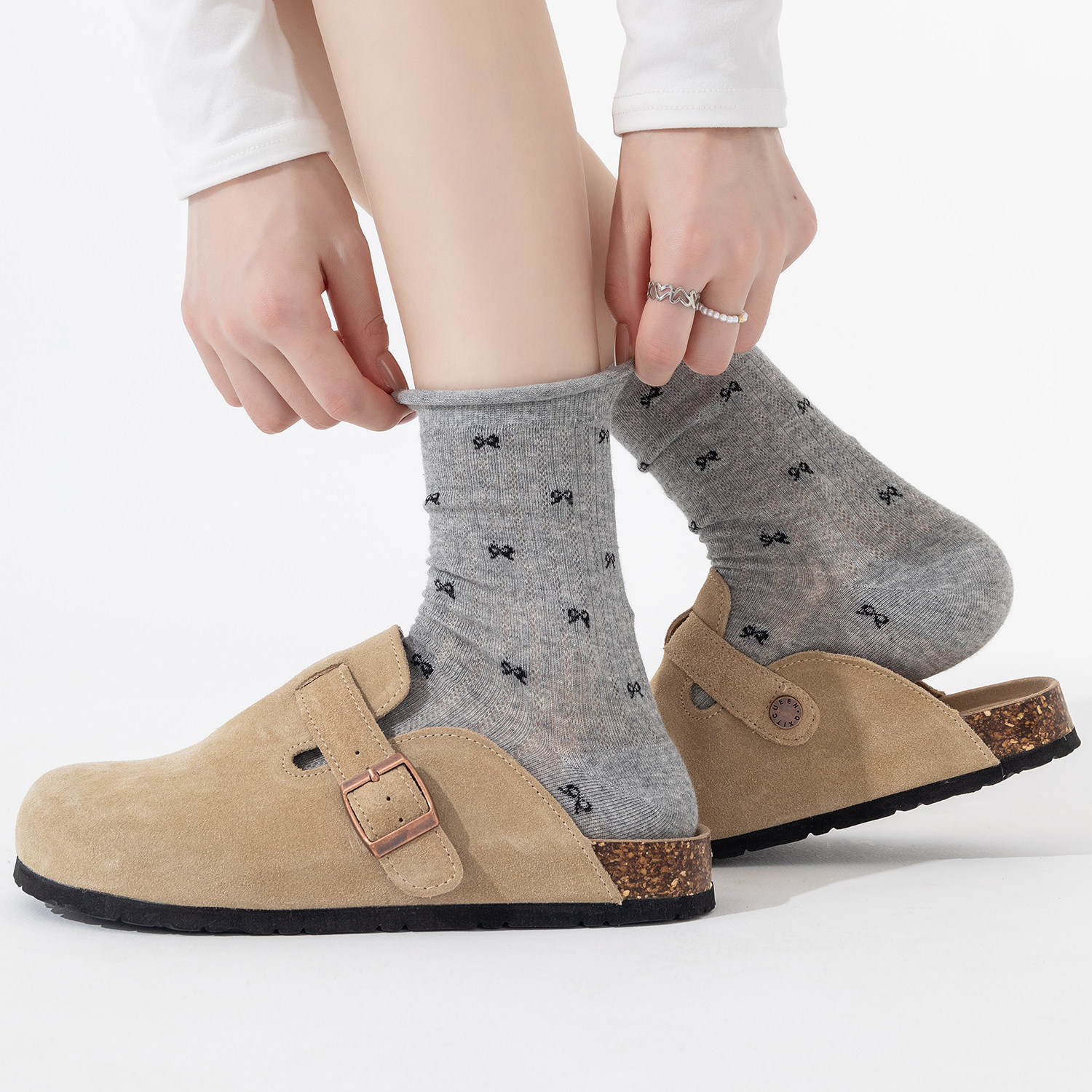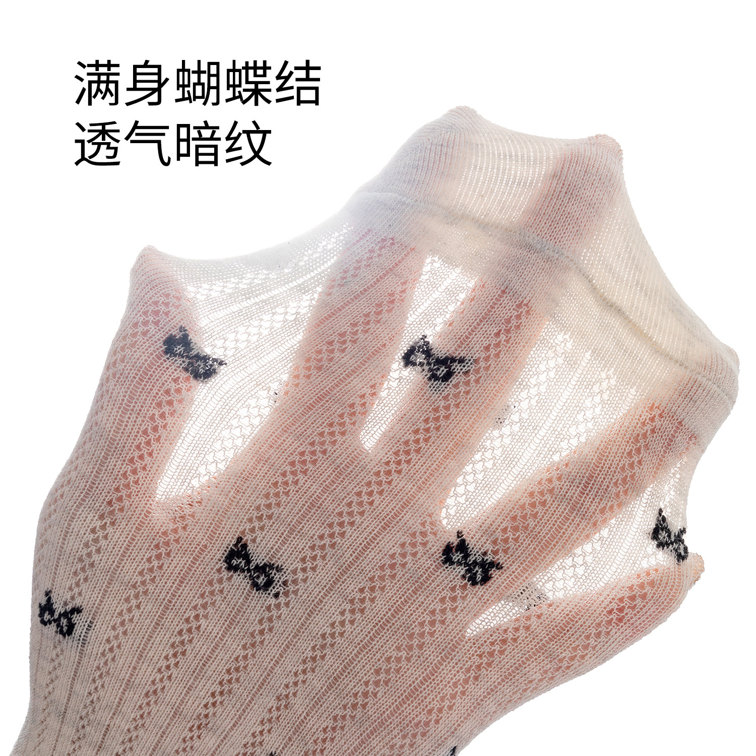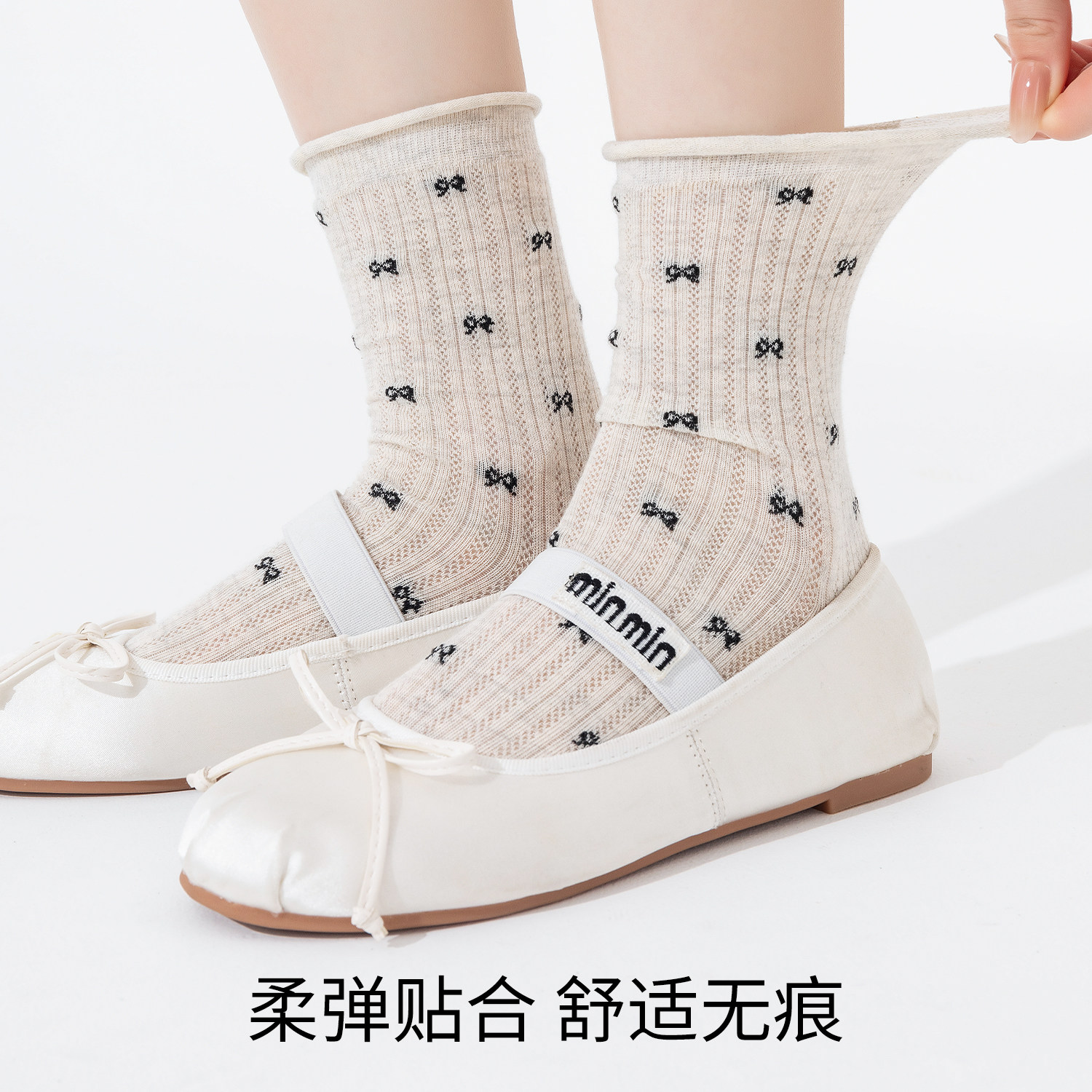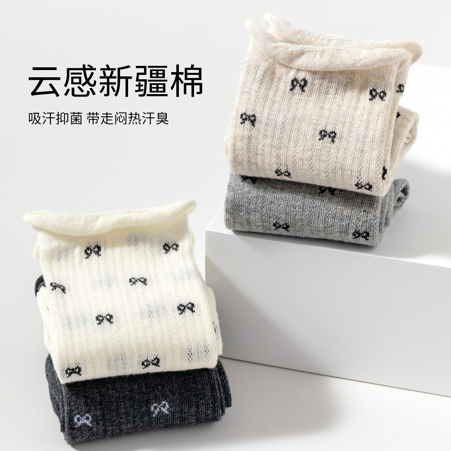 蝴蝶结袜子女夏季 灰色堆堆袜网眼透气吸汗长袜纯棉中筒袜夏天 薄款