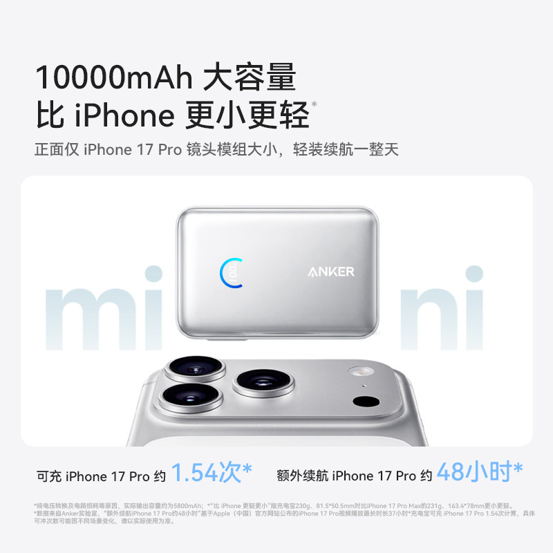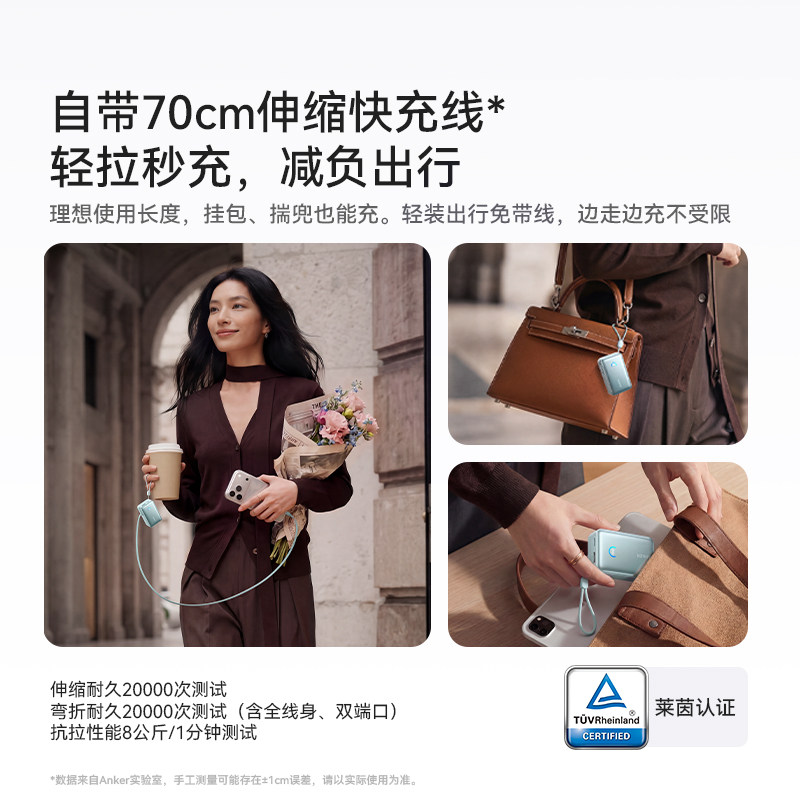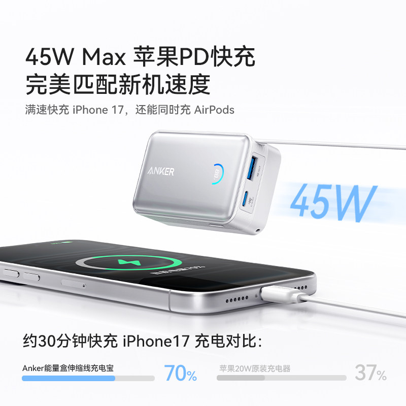 自带线45W快充小巧便携移动电源适用iphone17安卓 Anker安克能量盒伸缩线充电宝10000毫安 3C认证可上飞机