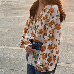 oil painting chiffon Girls 雪纺衫 rose shirt女生长袖 yellow