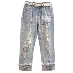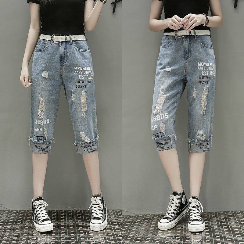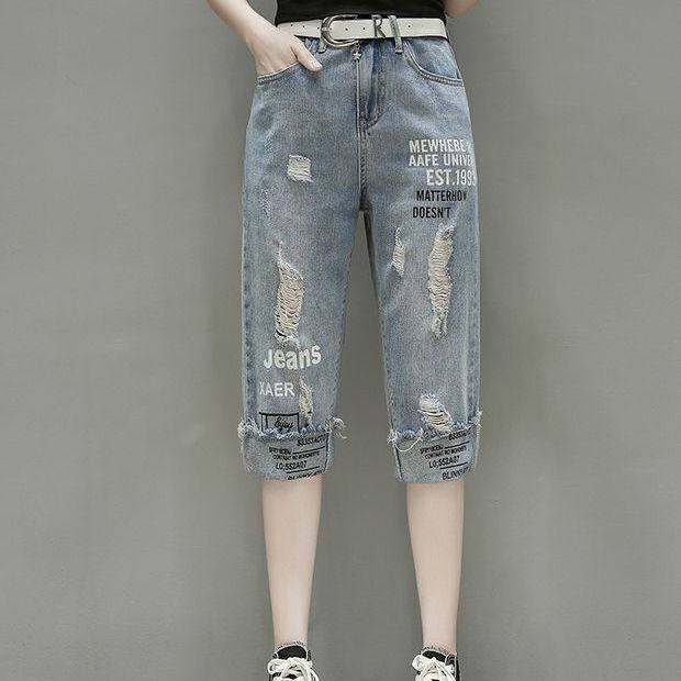 女2024夏季 显瘦破洞印花牛仔七分裤 大码 胖妹妹时尚 女 女装 宽松中裤