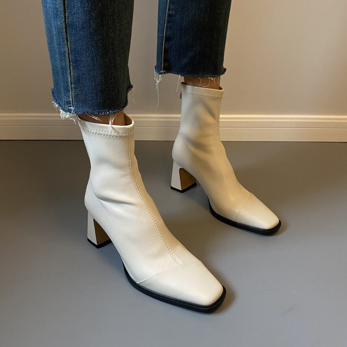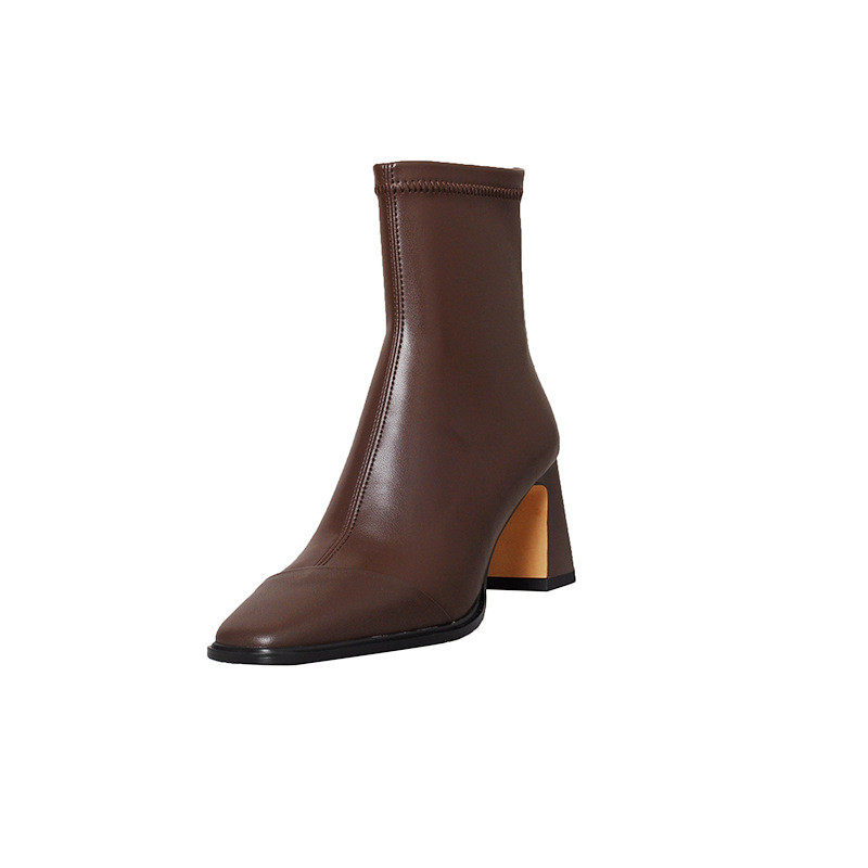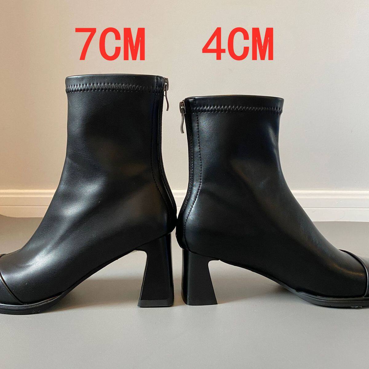复古瘦瘦靴女马丁靴秋冬加绒方头高跟鞋 法式 短靴粗跟 牛皮版 现货