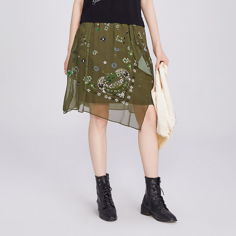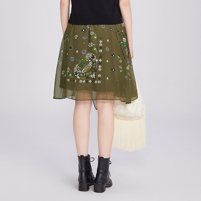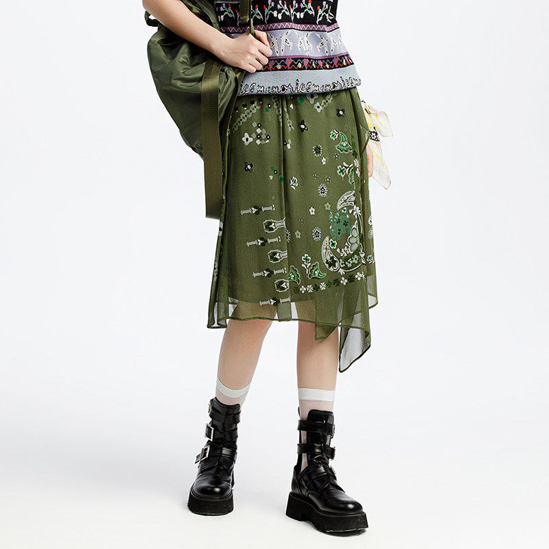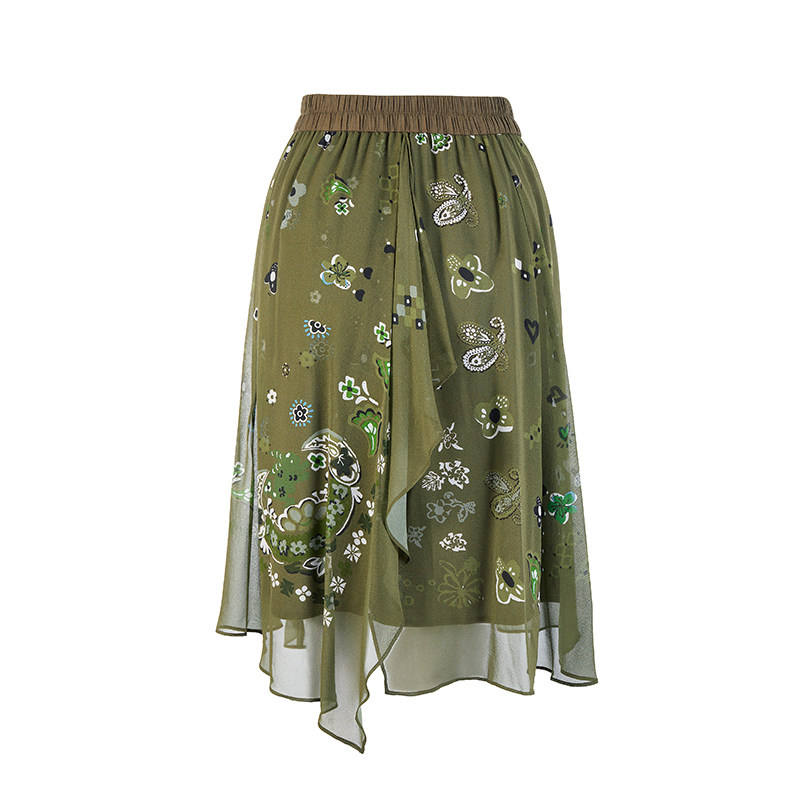 FGHA7210 桑蚕丝真丝印花中长裙休闲时尚 渔牌女装 半身裙女2025新款