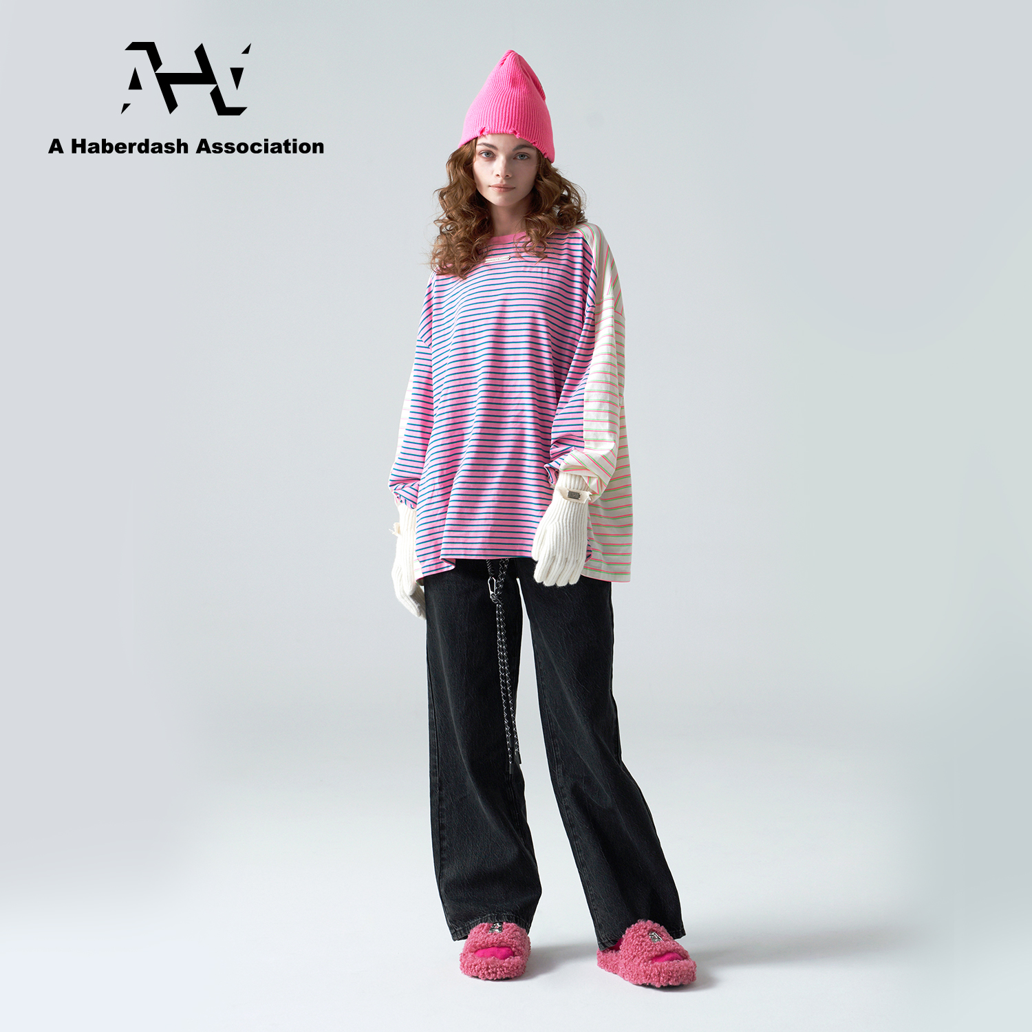 宽松圆领T恤打底衫 条纹拼色长袖 玲花张佳宁同款 AHA爱侈艾·