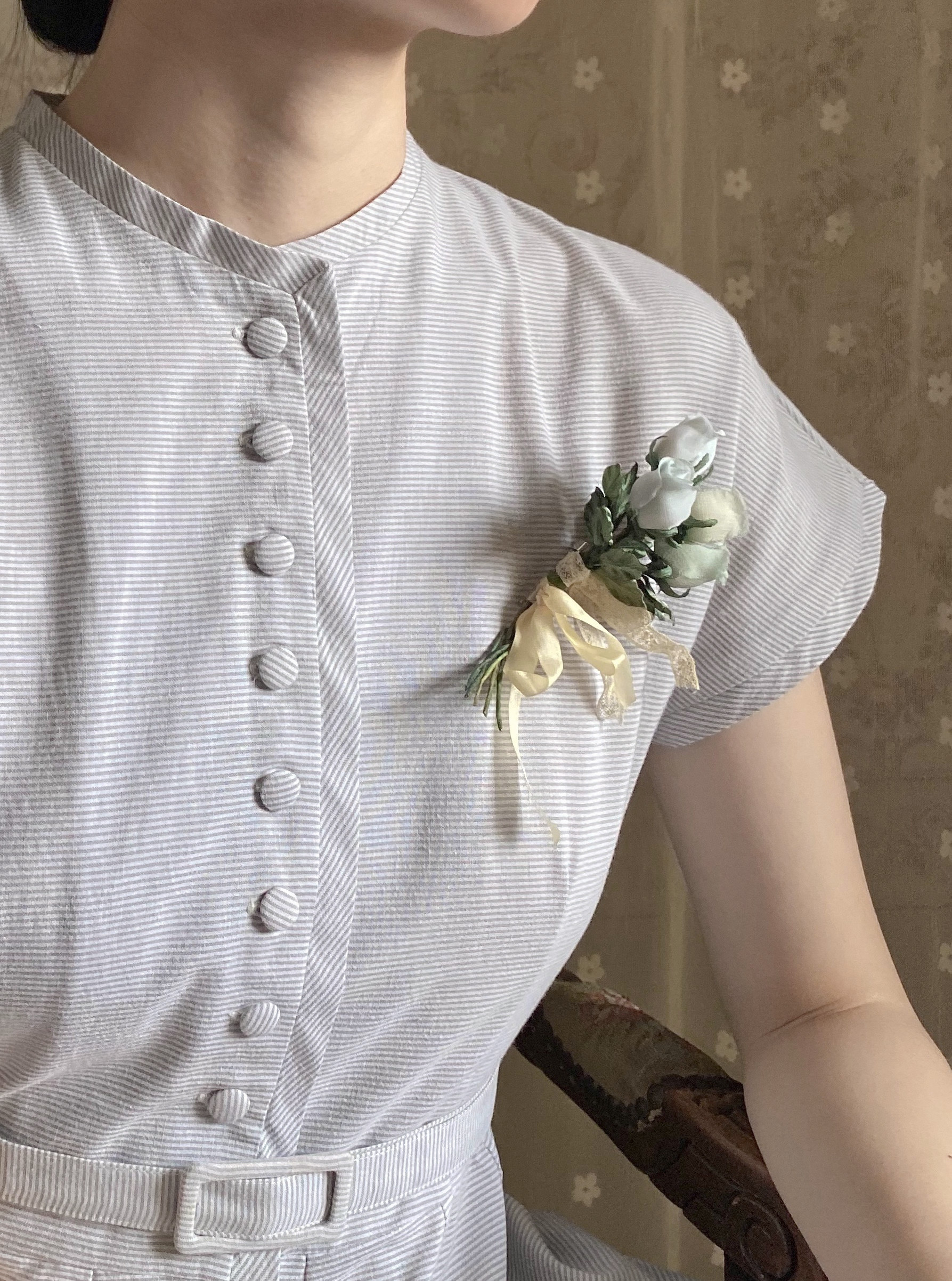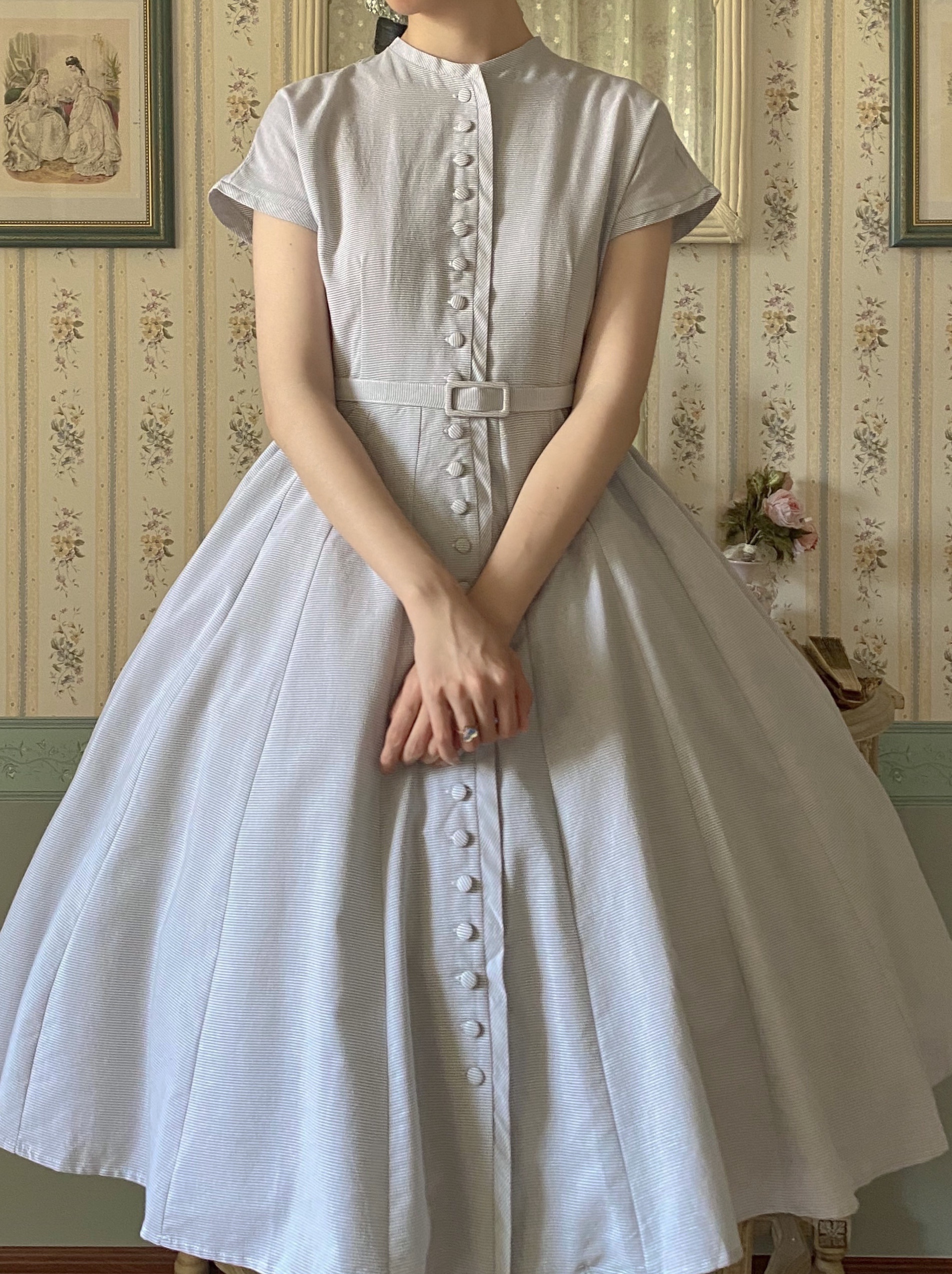 vintage1950s乱世佳人细条纹显瘦高腰中长裙画报款 复古赫本连衣裙