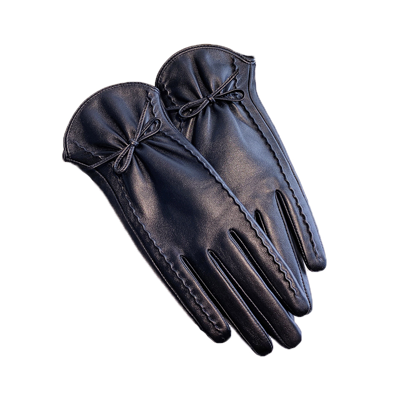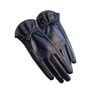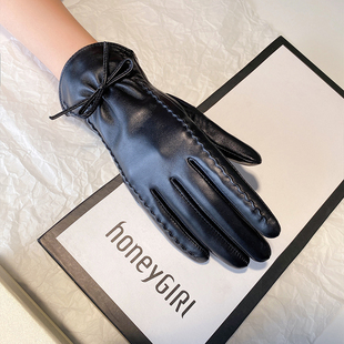 韩版 保暖加绒加厚骑行触屏防风 秋冬蝴蝶结小羊皮真皮手套女士冬季