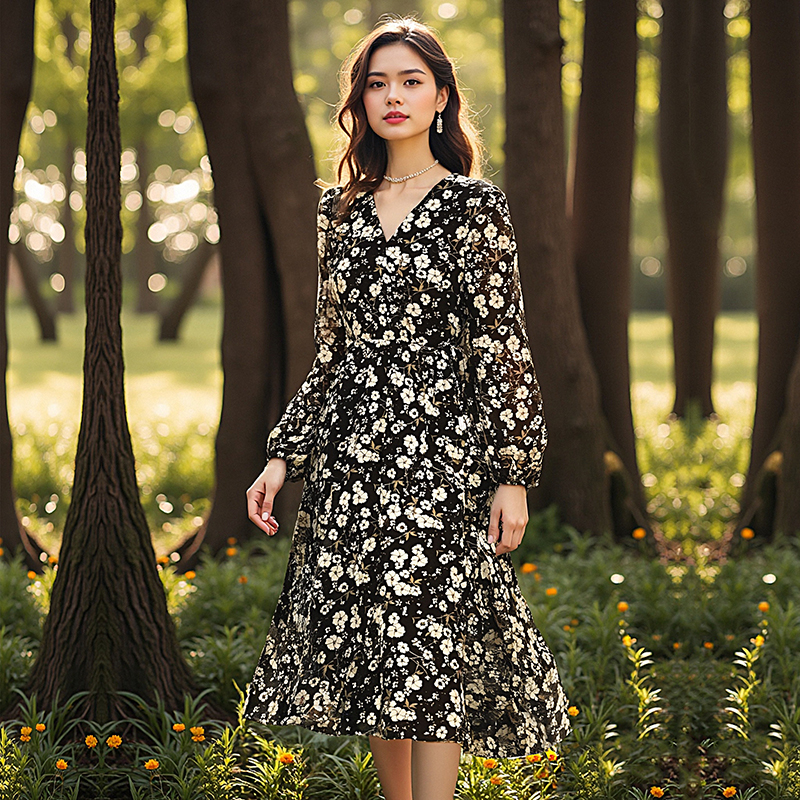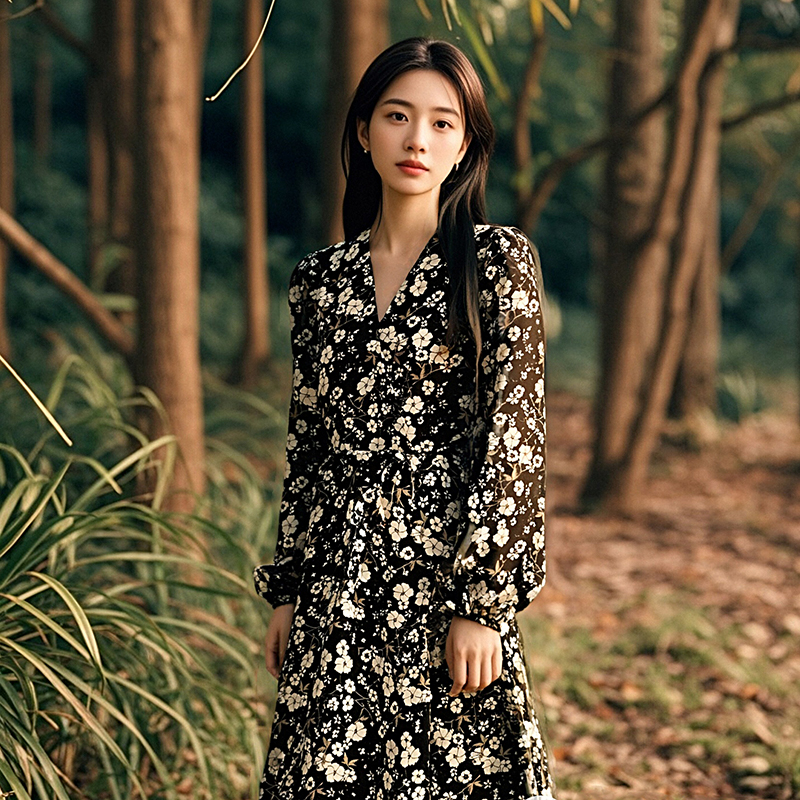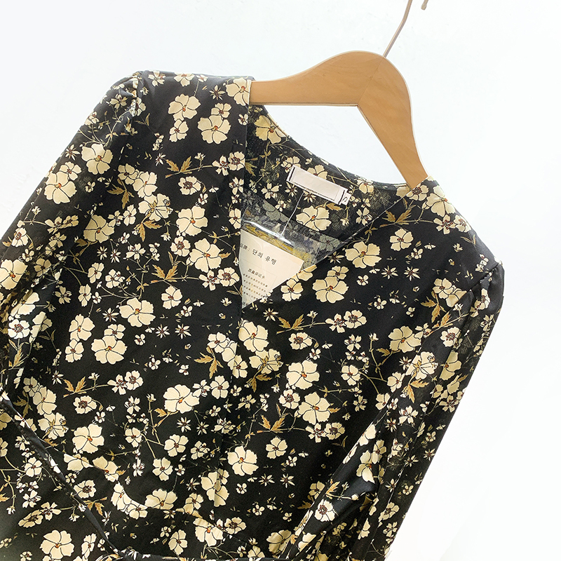 过膝系带收腰连衣裙女春夏 温柔风碎花雪纺裙 韩国单 岁月静好