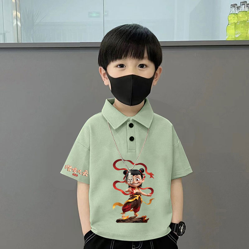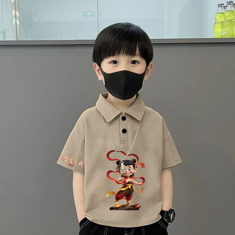 新款 2025夏季 男女童简约卡通哪吒百搭翻领上衣 POLO衫 儿童纯棉短袖