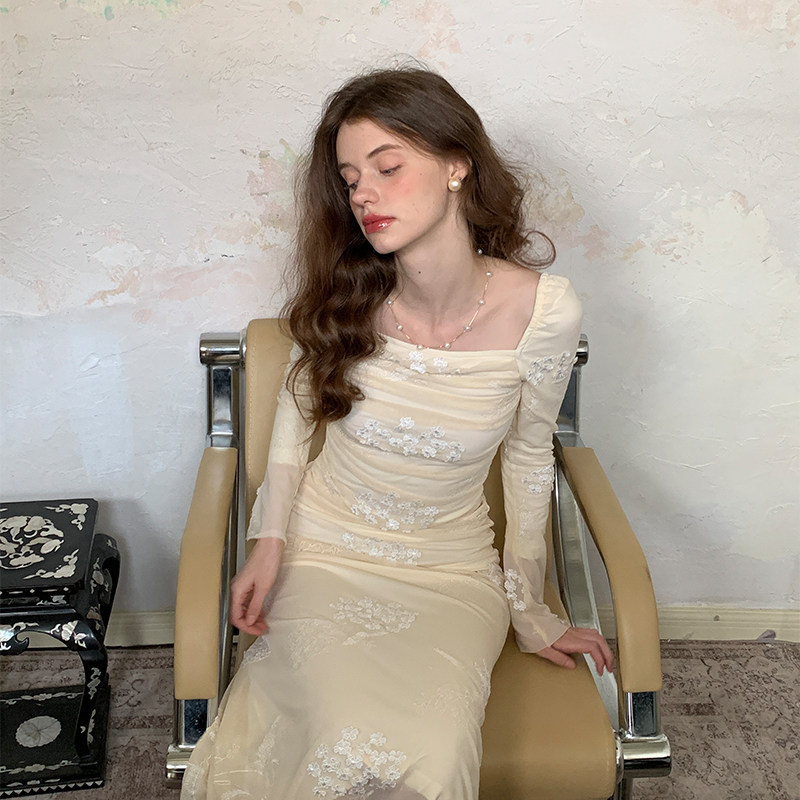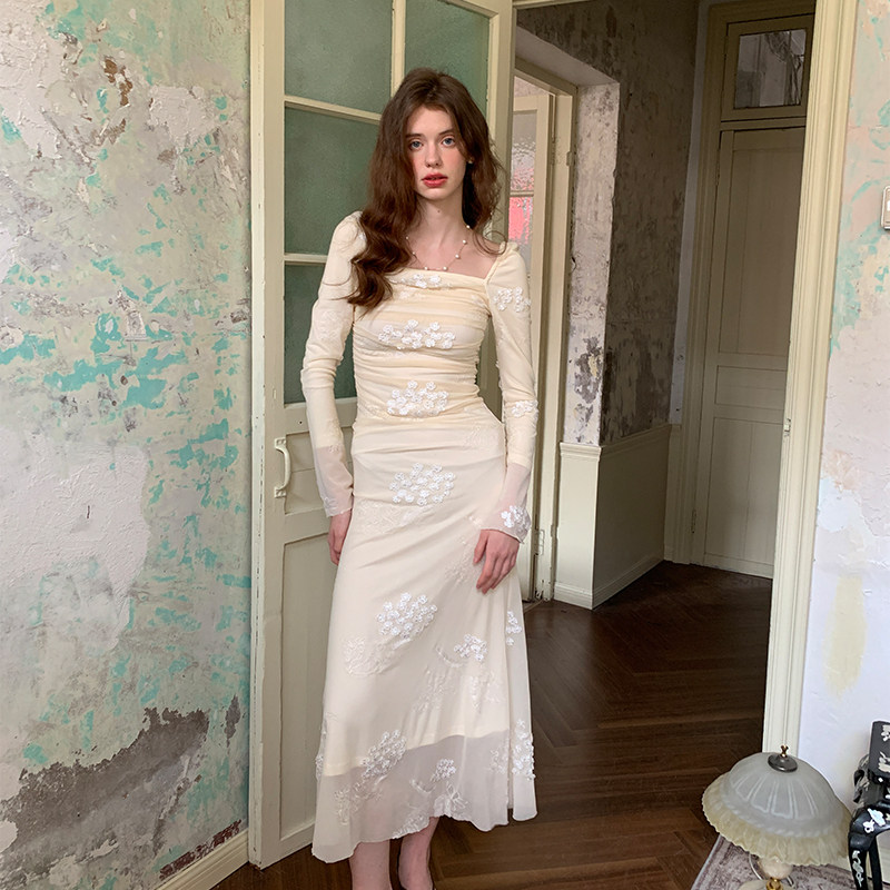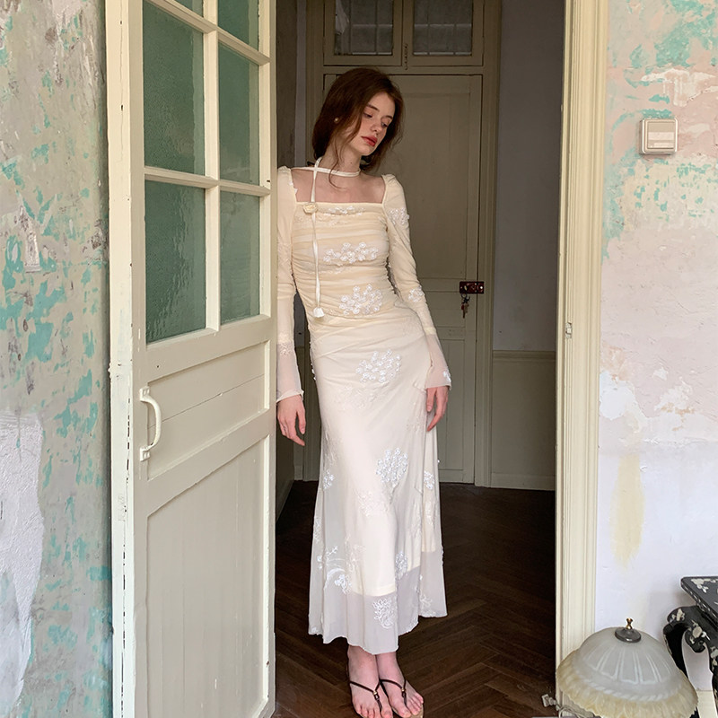 白色早秋长袖 重工蕾丝刺绣修身 连衣裙女原创设计显瘦 法式 ZHUYIYI