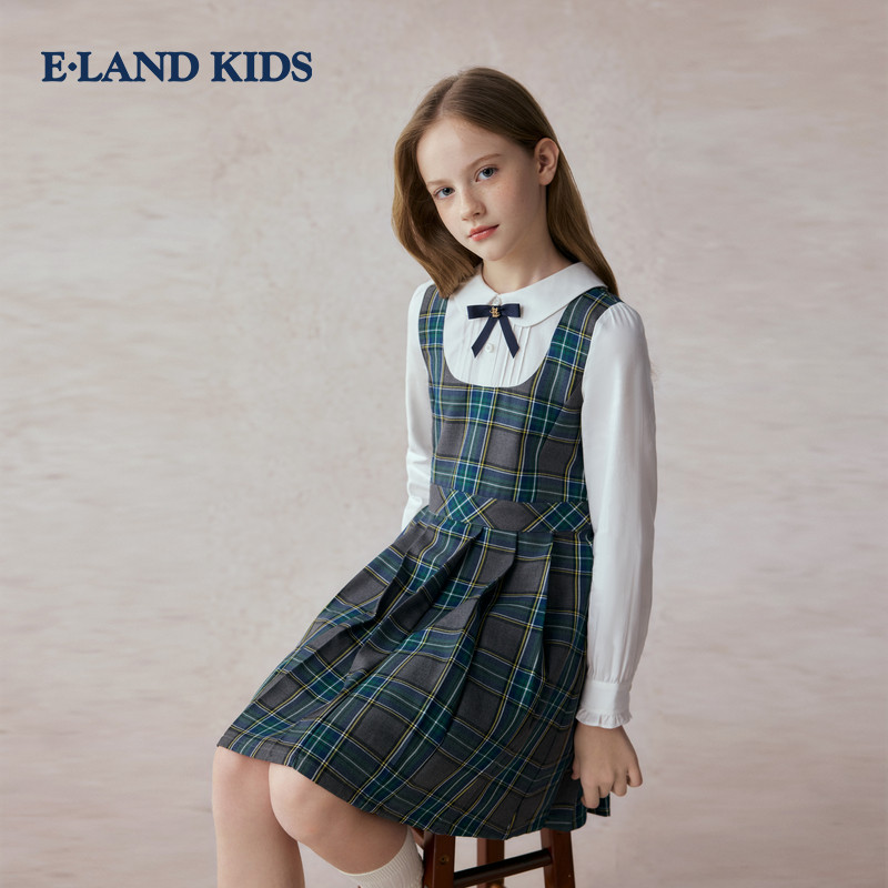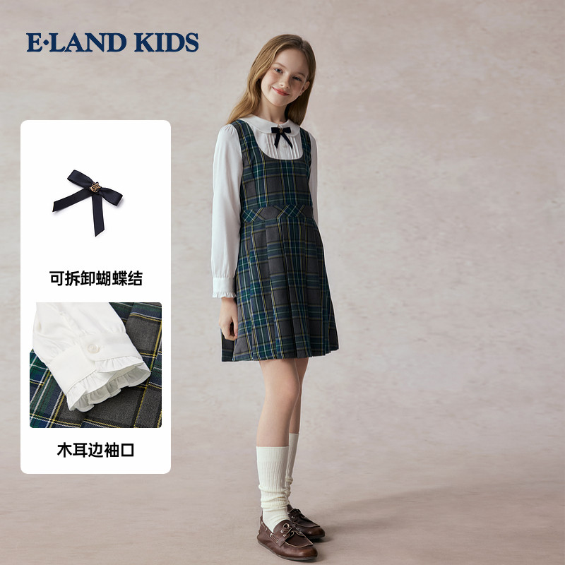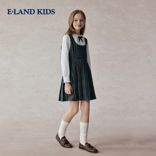 假两件蝴蝶结格子演出服 女童连衣裙25年秋新品 eland kids衣恋童装