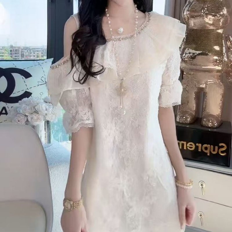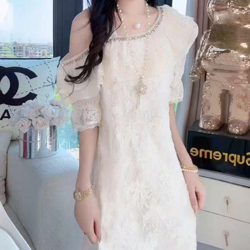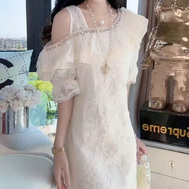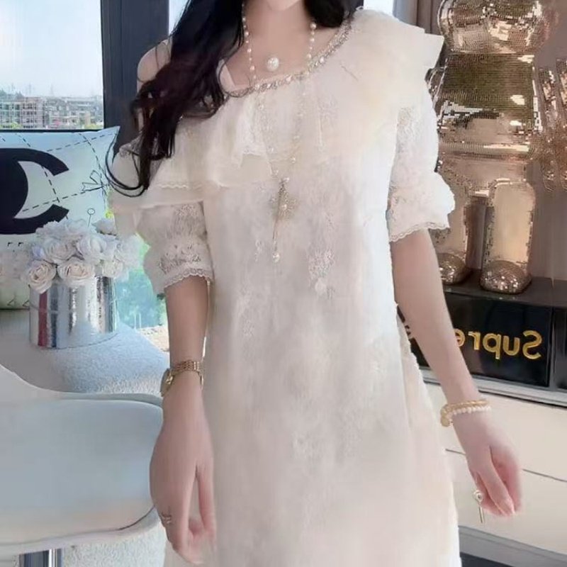 新款 减龄蕾丝斜肩连衣裙2025夏季 高档名媛显瘦遮肉A字裙 时尚 韩版