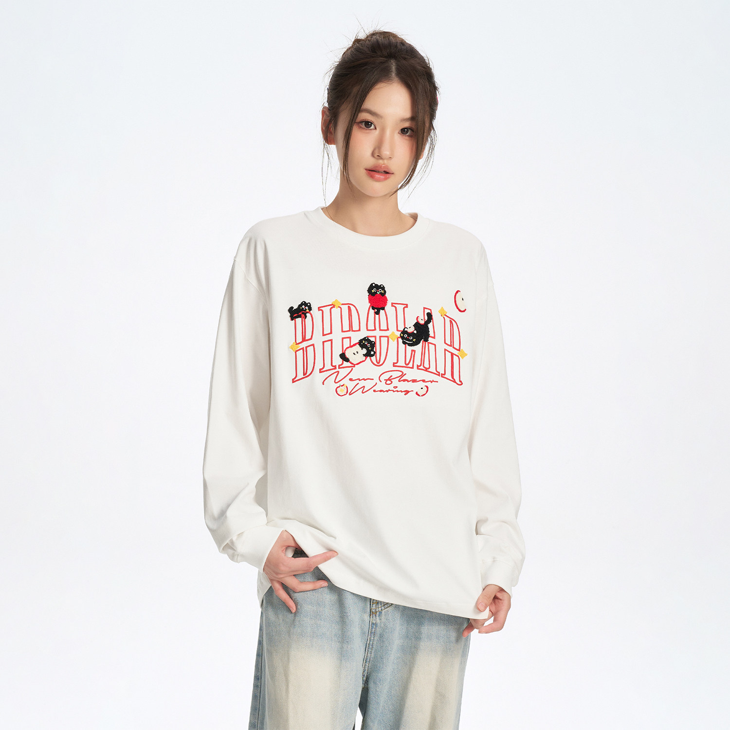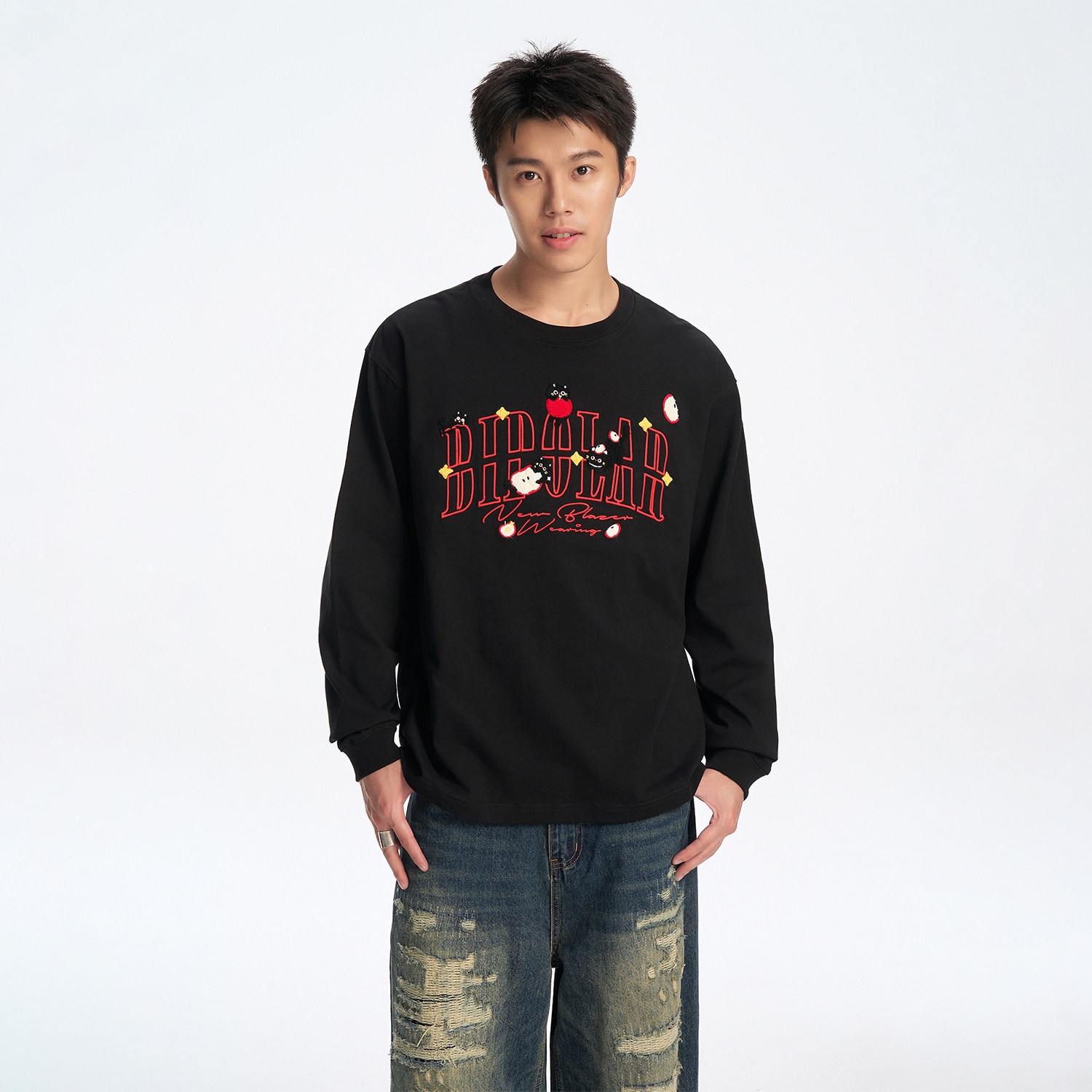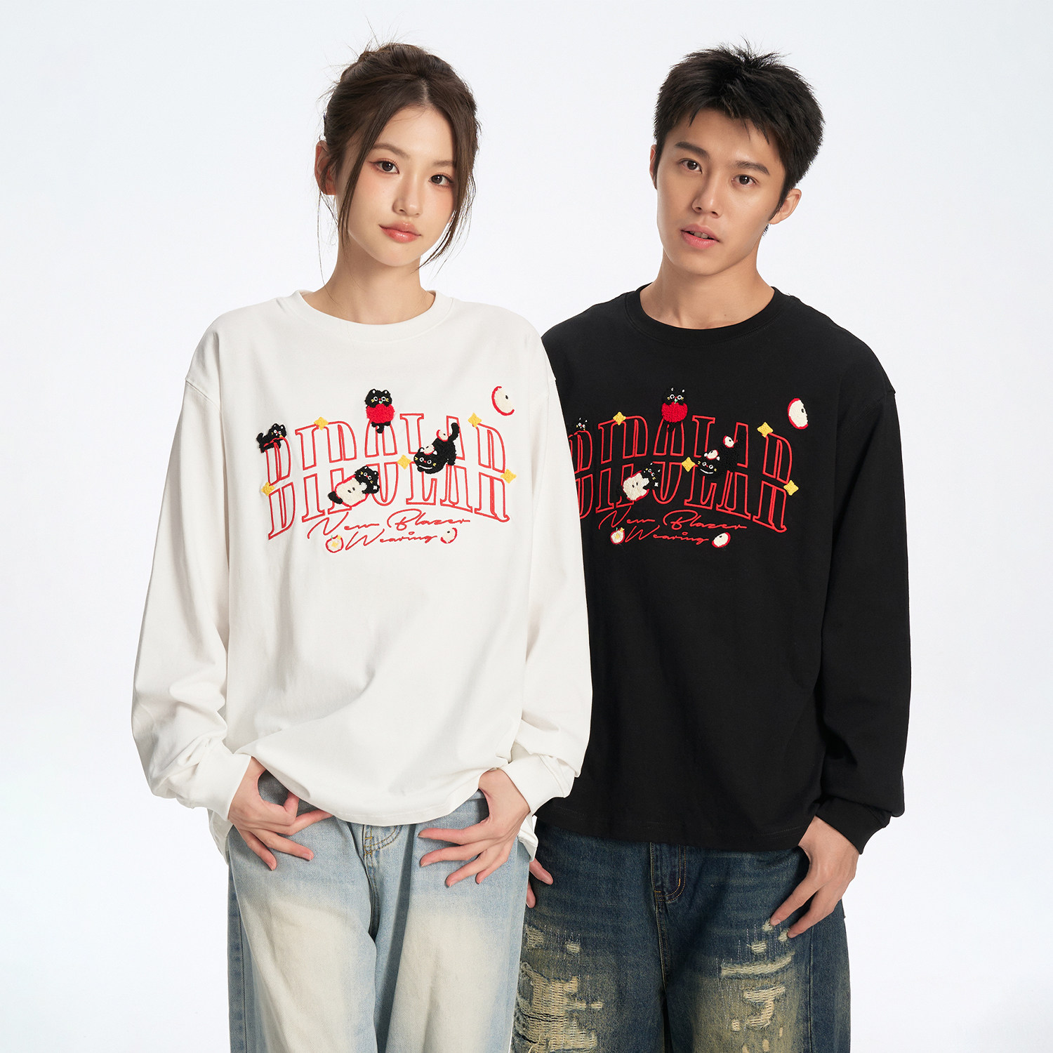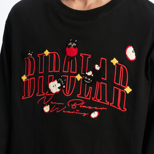 秋 休闲宽松圆领上衣男嘻哈国潮情侣新款 BIPOLAR苹果猫长袖 T恤美式