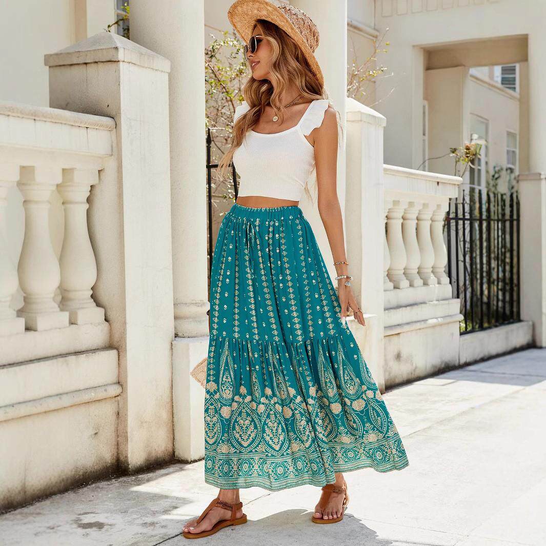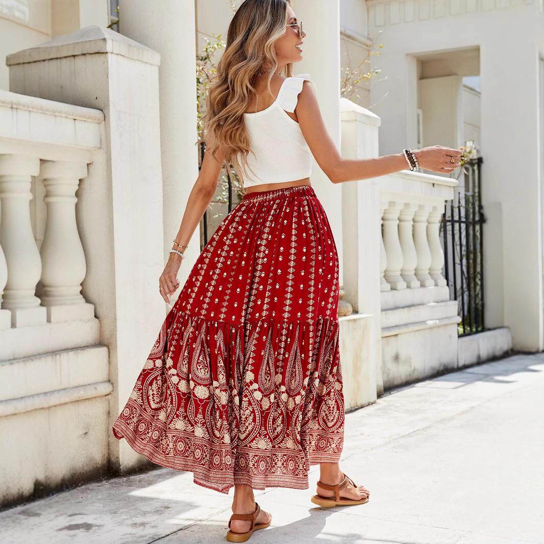 欧美波西米亚复古印花云民族度假风半身裙长裙人棉棉绸海边沙滩裙