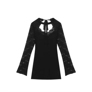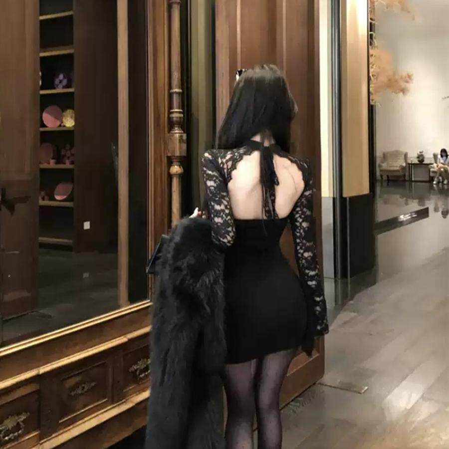 包臀短裙子冬 蕾丝拼接黑色收腰修身 纯欲风露背长袖 连衣裙女春秋季