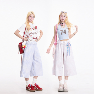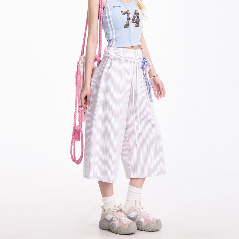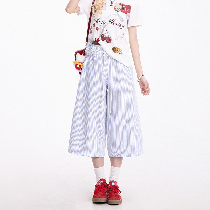 短裤 NERESUM韩系蕾丝花边条纹七分裤 女复古阔腿显瘦松弛感夏季