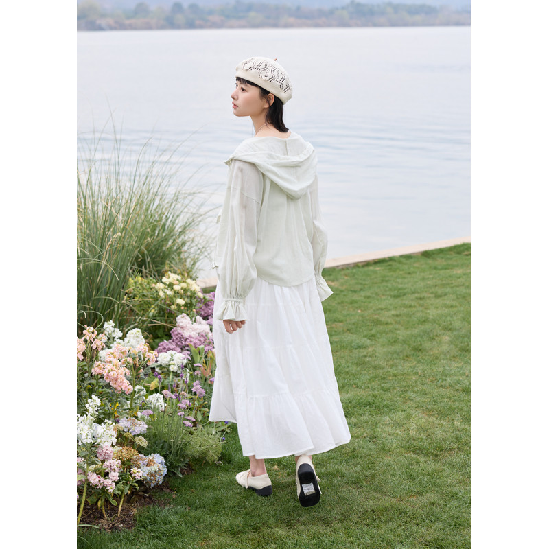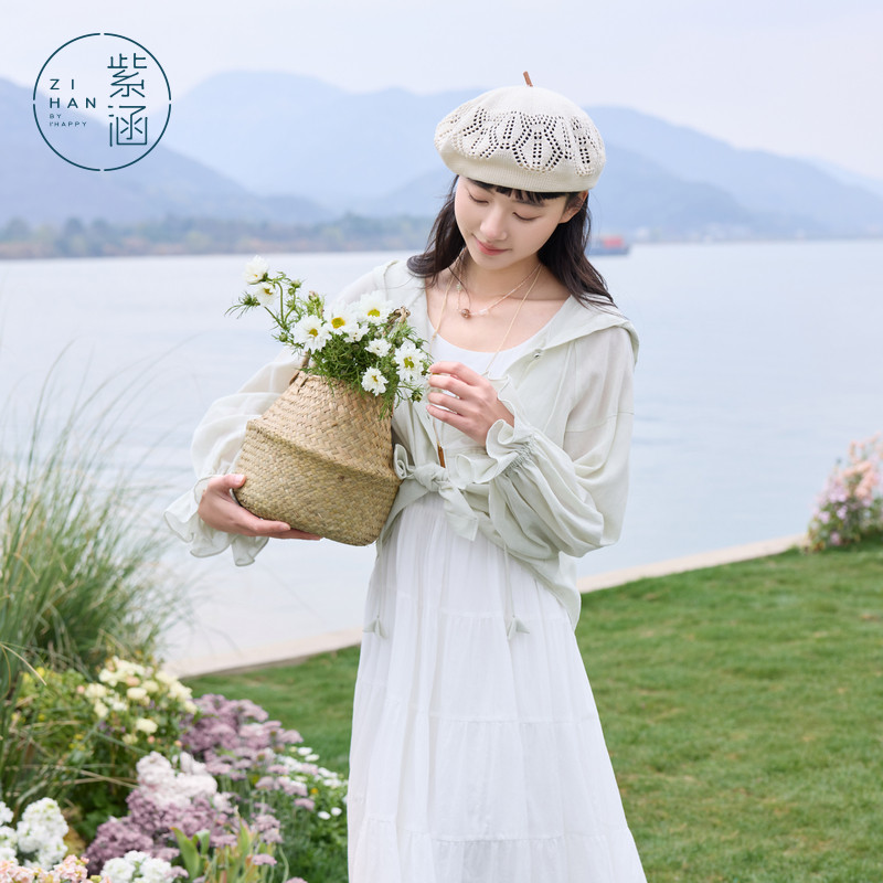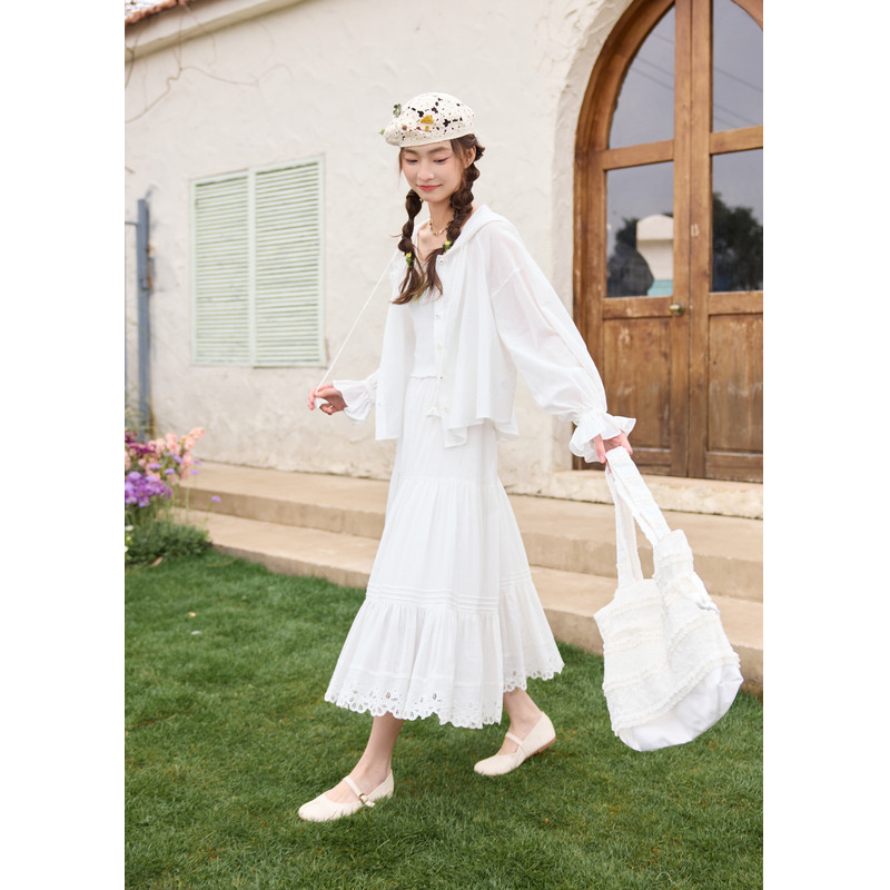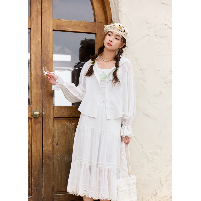 白色衬衫 开衫 外套女夏季 户外遮阳宽松抽绳长袖 新款 紫涵连帽蝙蝠袖
