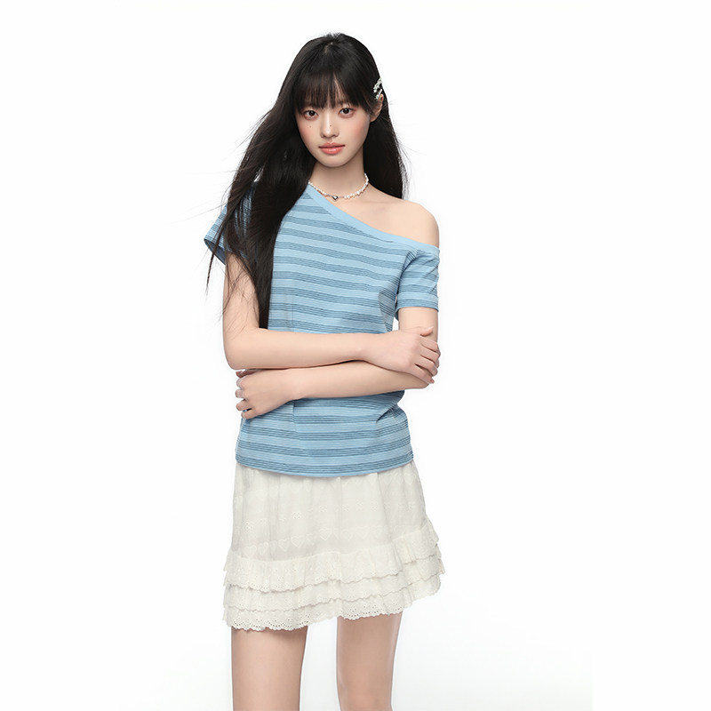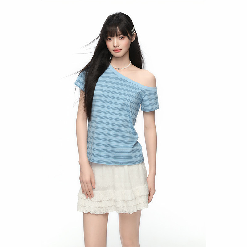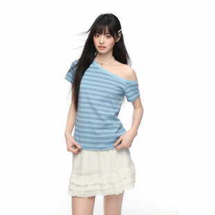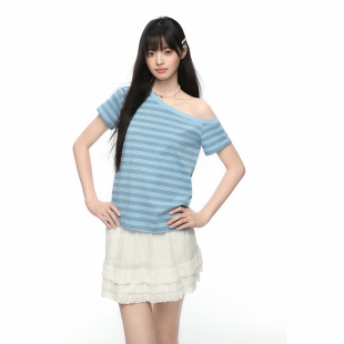 韩版 T恤女夏季 显瘦一字肩上衣 Prince复古休闲条纹斜肩短袖 King