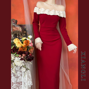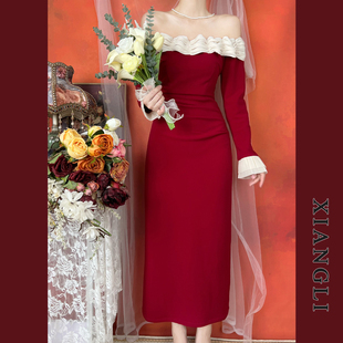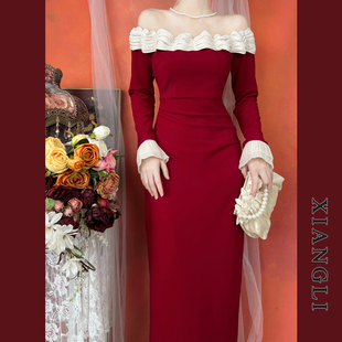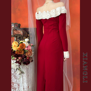 巷里法式 一字肩赫本拼接显瘦气质小礼服中长裙 复古红色连衣裙秋季