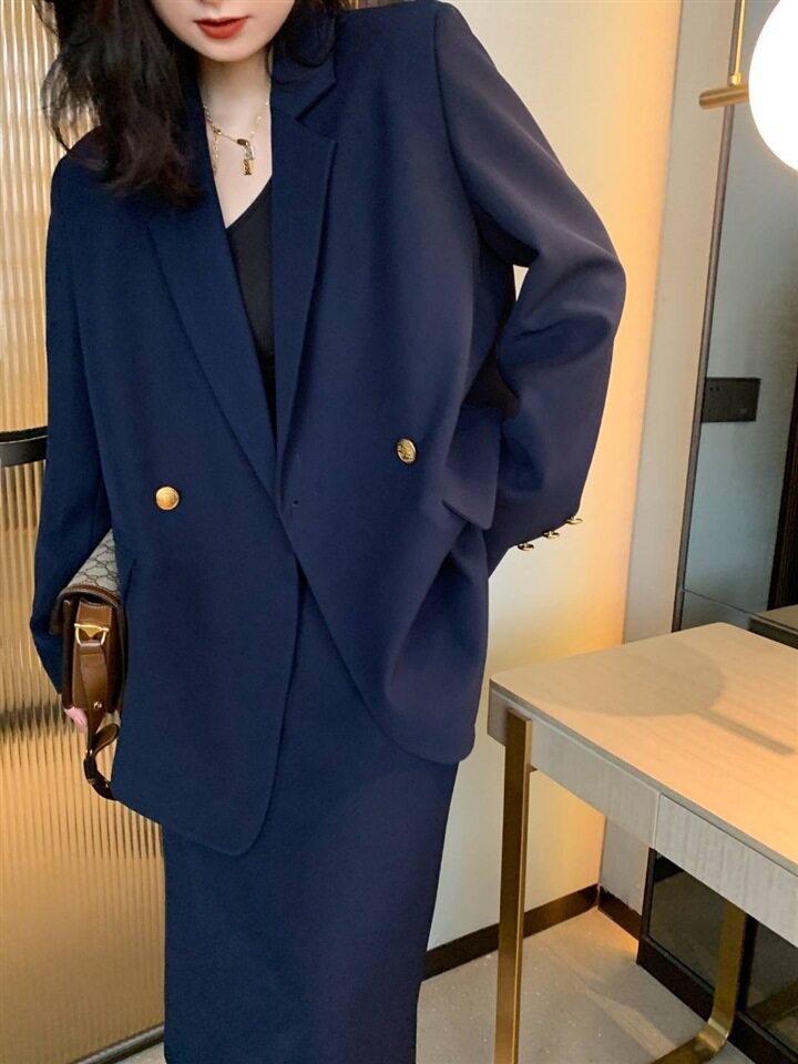 显瘦藏青职业西装 工装 裙子套装 新款 西服两件套200斤 秋季 胖mm大码