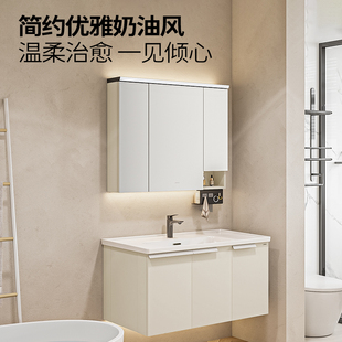 奶油色陶瓷一体盆浴室柜组合实木卫生间洗脸盆洗手盆洗漱台洗手台