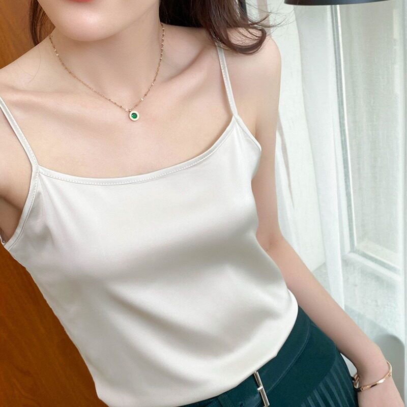 外穿潮 新款 真丝吊带背心女内搭打底配西装 桑蚕丝质缎面一字领春季
