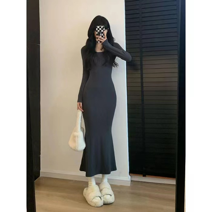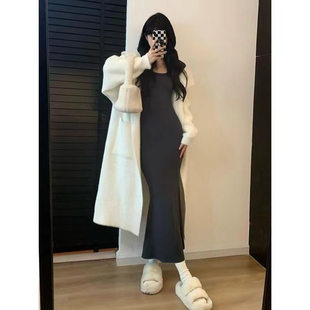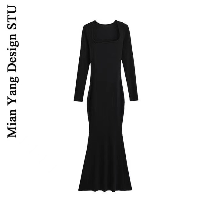 修身 春秋季 长裙秋冬季 长款 显瘦打底连衣裙内搭方领紧身裙子 新款