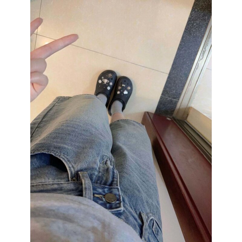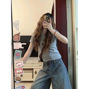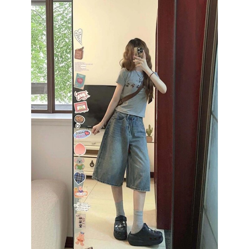 胖mm高腰显瘦直筒阔腿中裤 大码 女夏季 复古a字七分牛仔短裤 子 美式