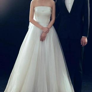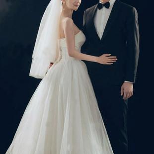 法式 缎面抹胸轻婚纱山间铃兰小拖尾新娘迎宾出门纱复古简约 新款