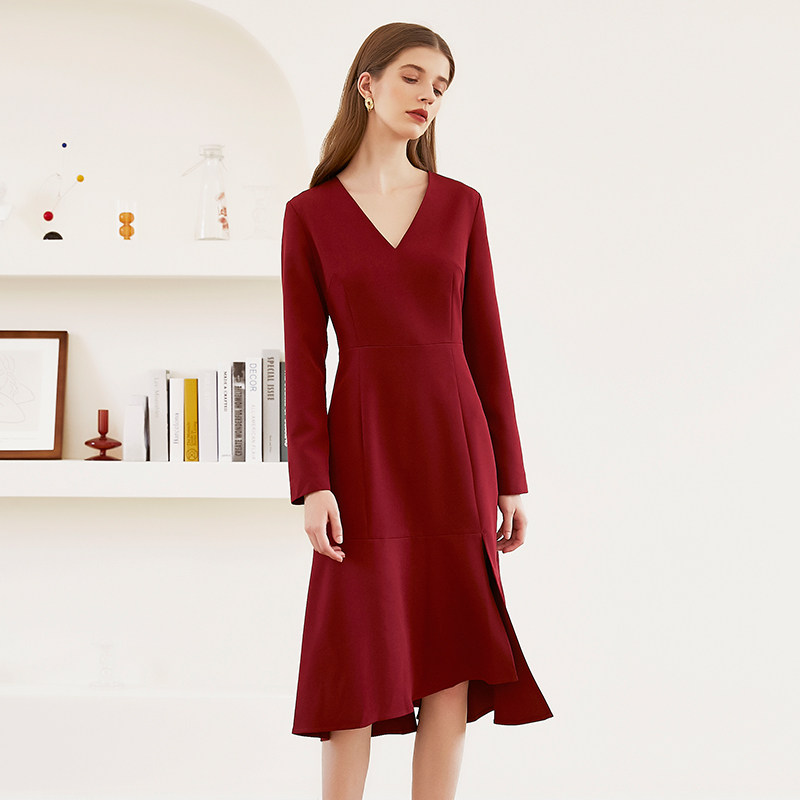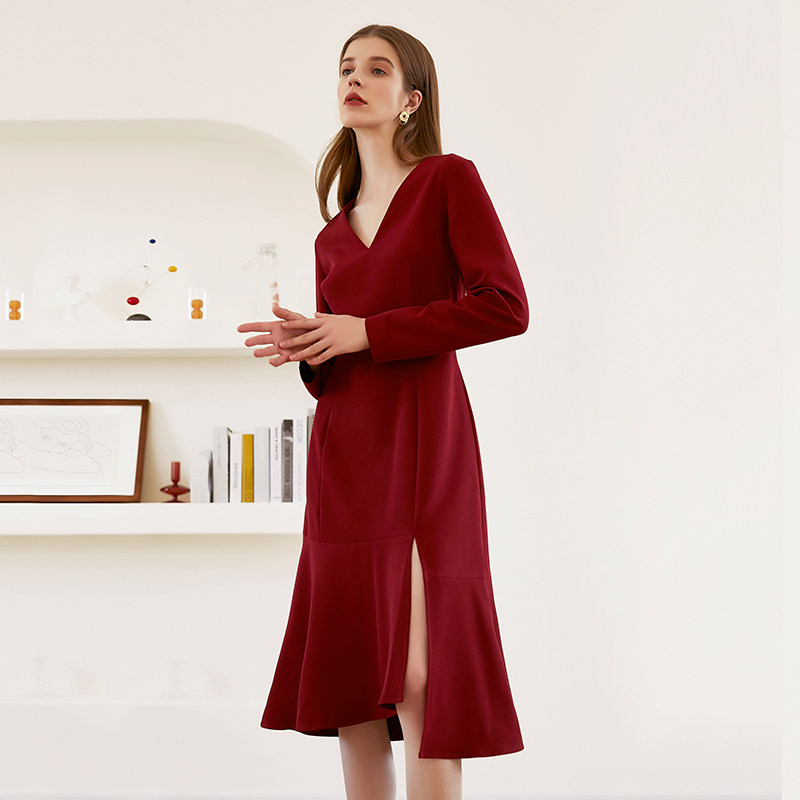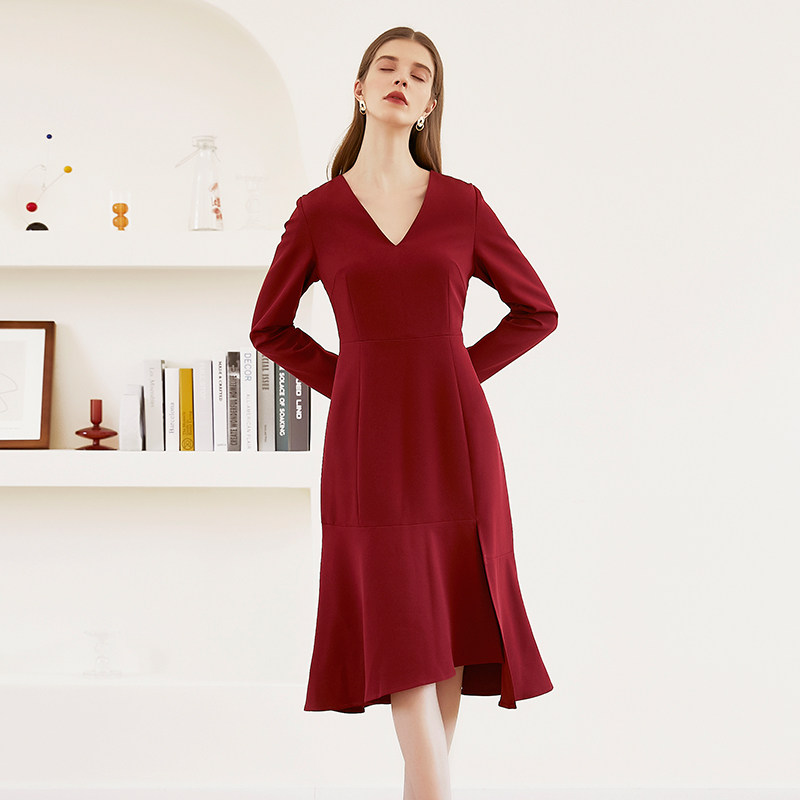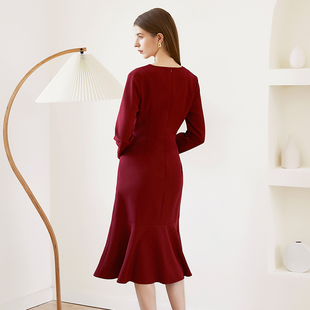 小红裙 酒红连衣裙年会礼服长袖 映想社交女装 秋冬季