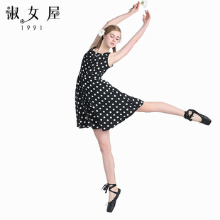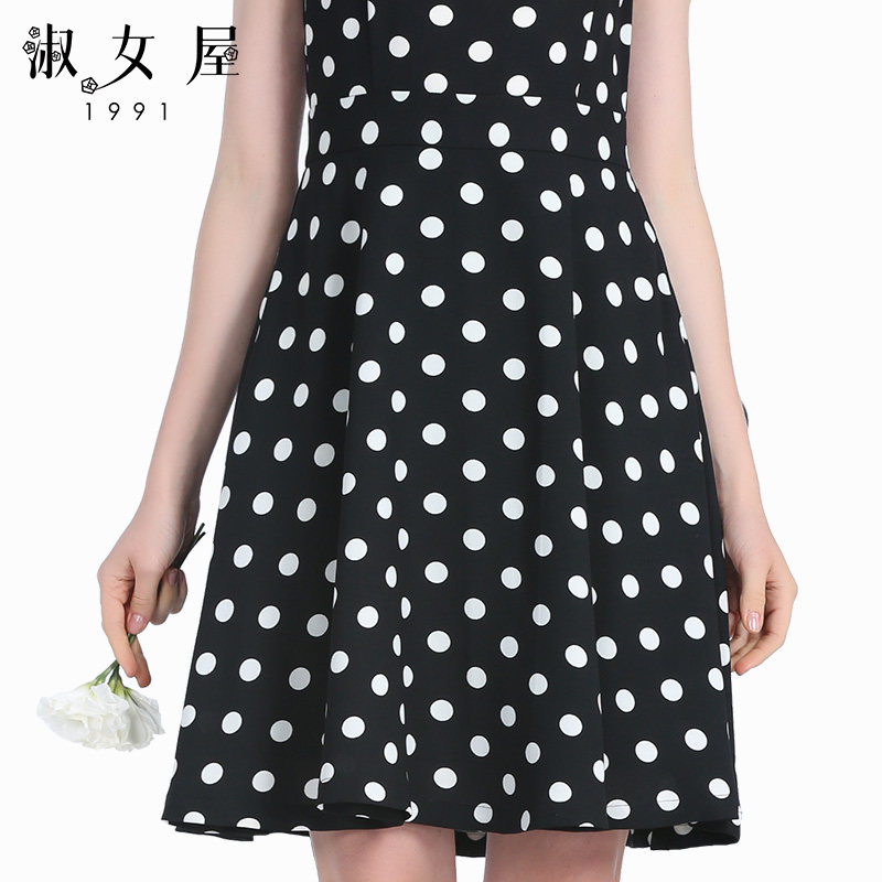 淑女屋A字裙显瘦波尔卡圆点公主优雅甜美吊带黑底白点雪纺连衣裙