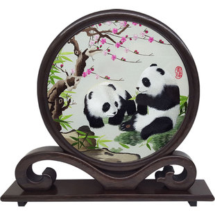 蜀绣双面绣大熊猫屏风手工刺绣摆件鸡翅木如意架礼品礼物成都特产
