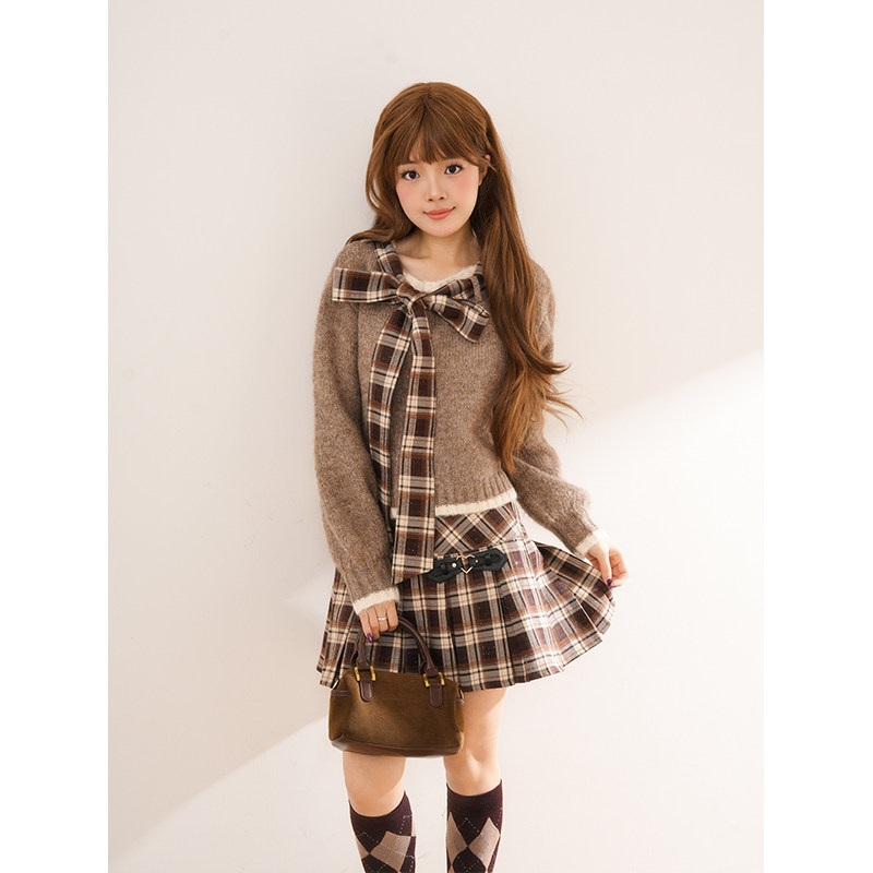 美拉德套装 格纹百褶裙秋冬新款 裙 假两件针织毛衣 松果收藏家