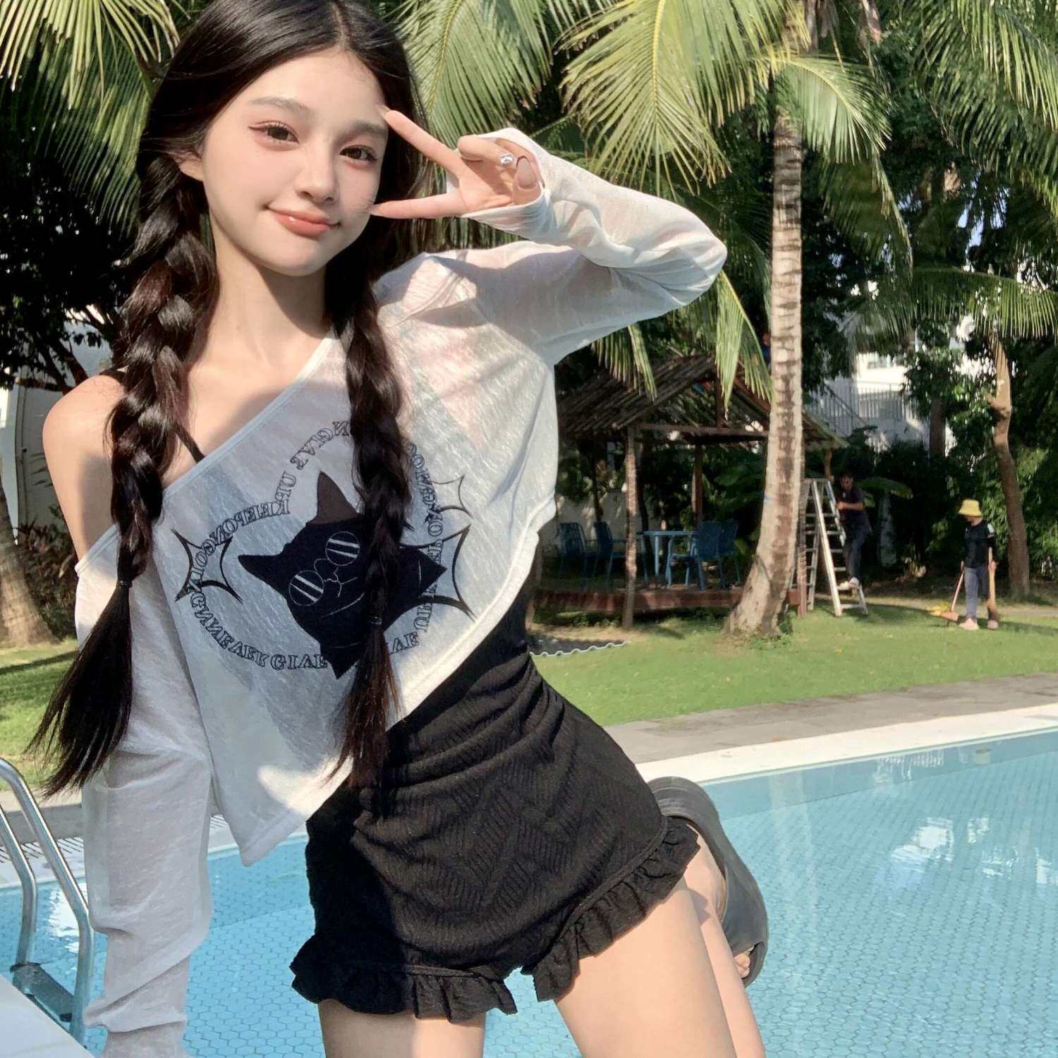 防晒游泳衣女泡温泉度假 罩衫 新款 可爱保守卡通小猫连体两件套长袖