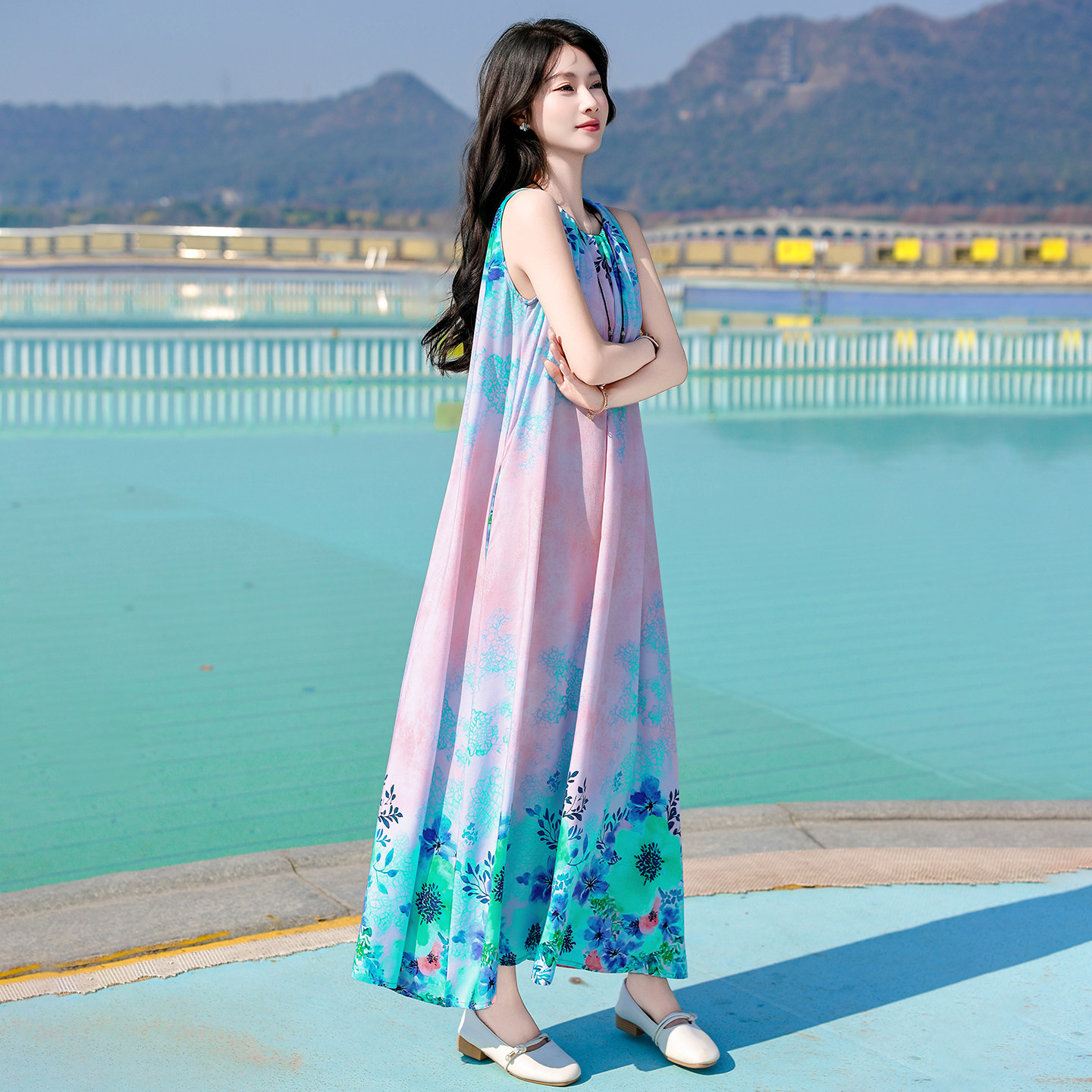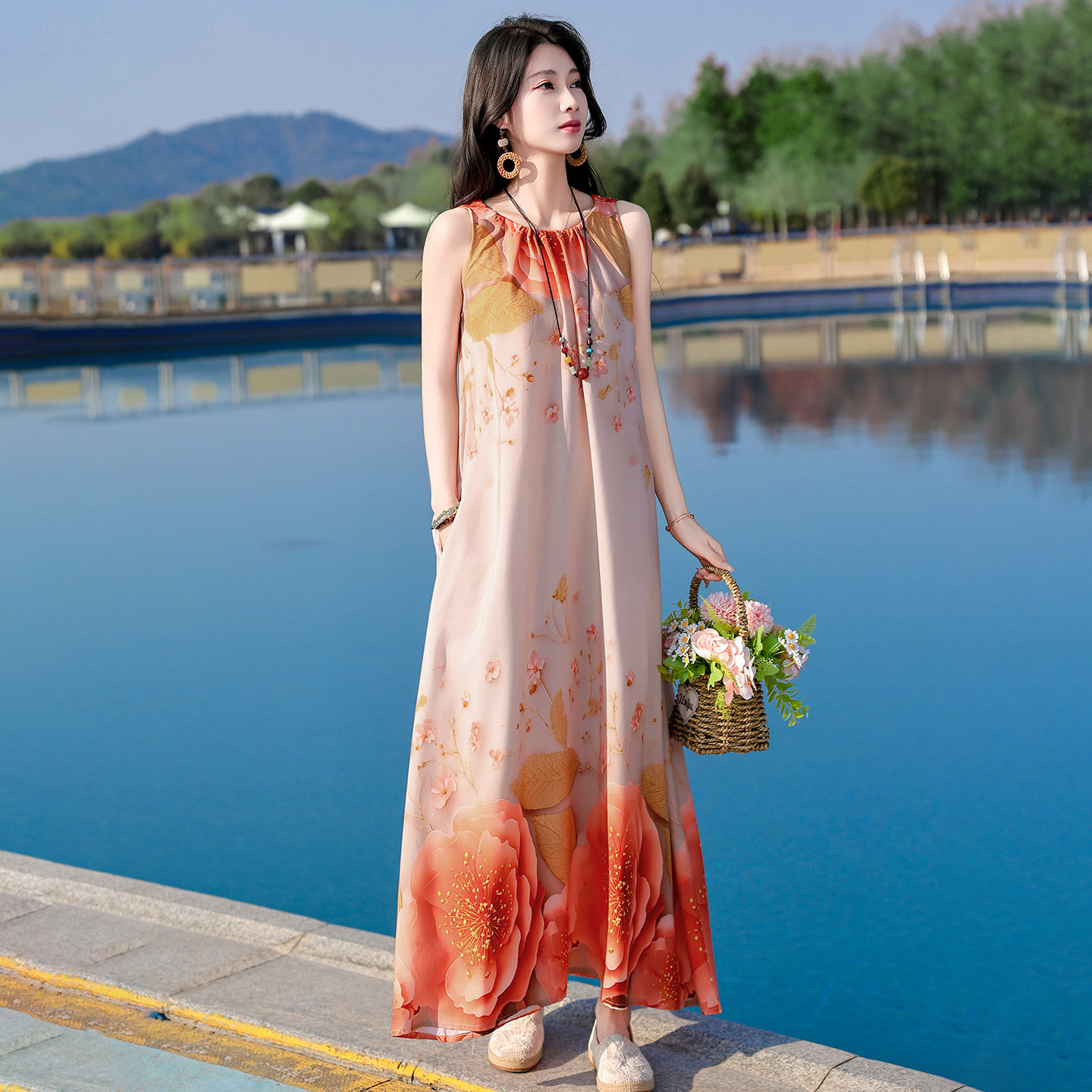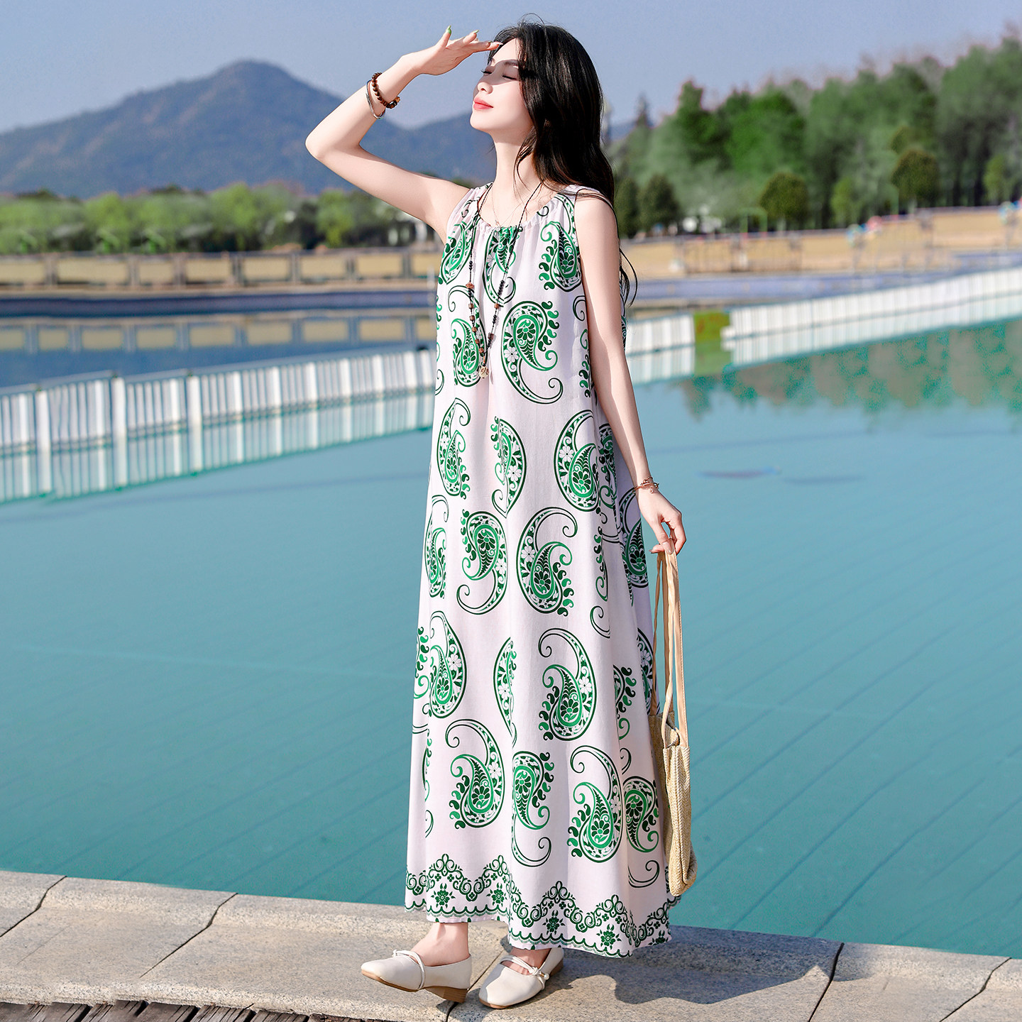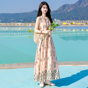 宽松大摆气质长裙 夏季 波西米亚风无袖 印花棉绸连衣裙中老年女装