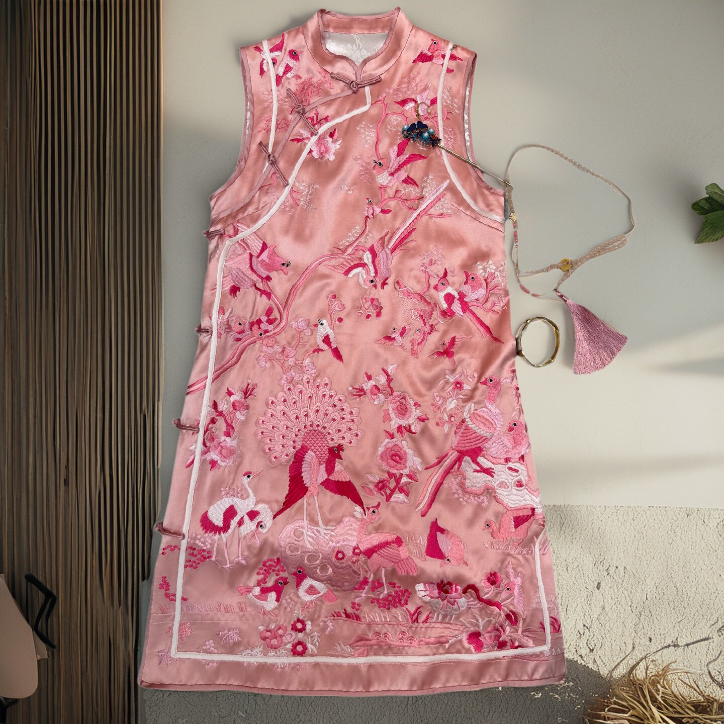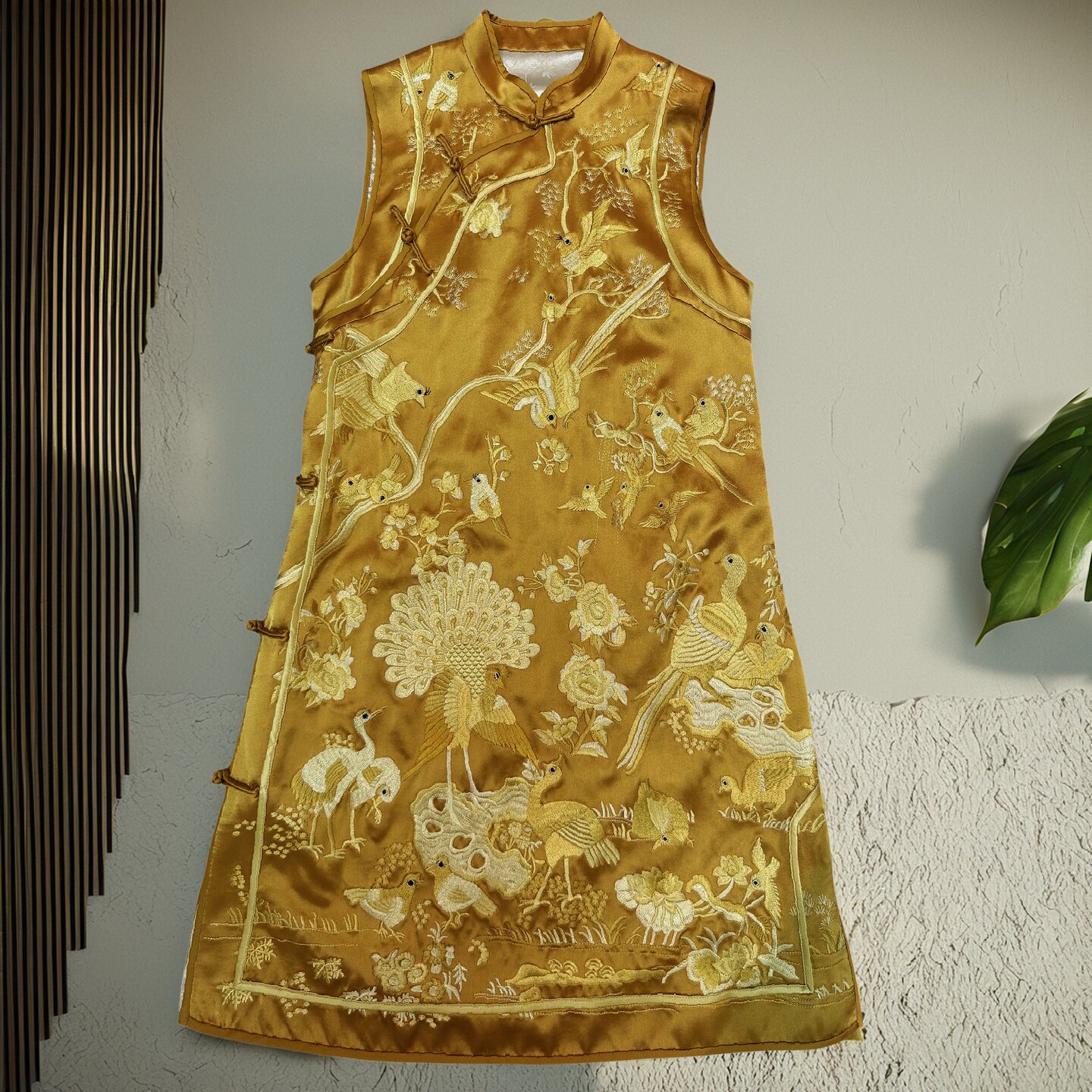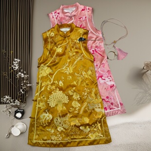 安娜滕改良旗袍女春秋复古风重工净色刺绣醋酸缎立领盘扣时尚 裙子