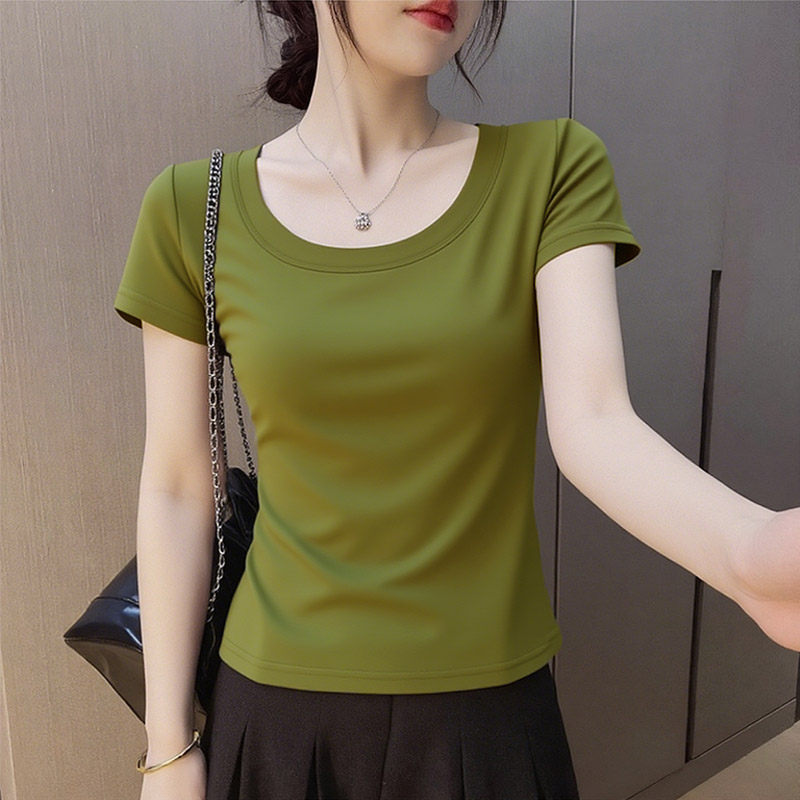 气质百搭正肩短袖 小衫 t恤女夏新款 圆领减龄显瘦修身 上衣 短款 时尚