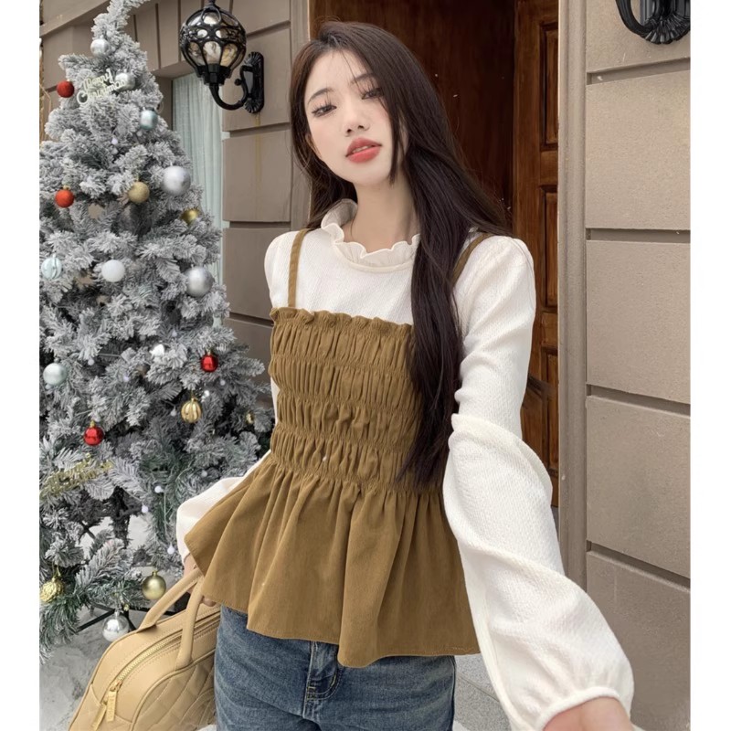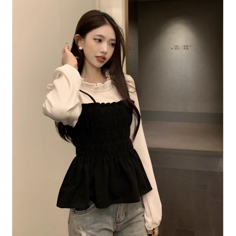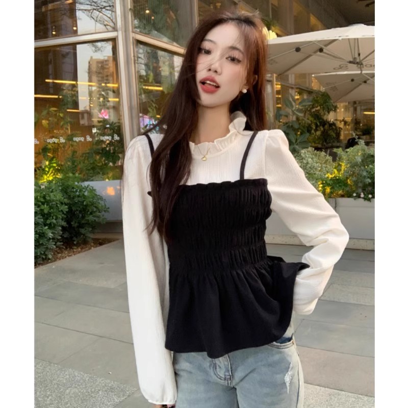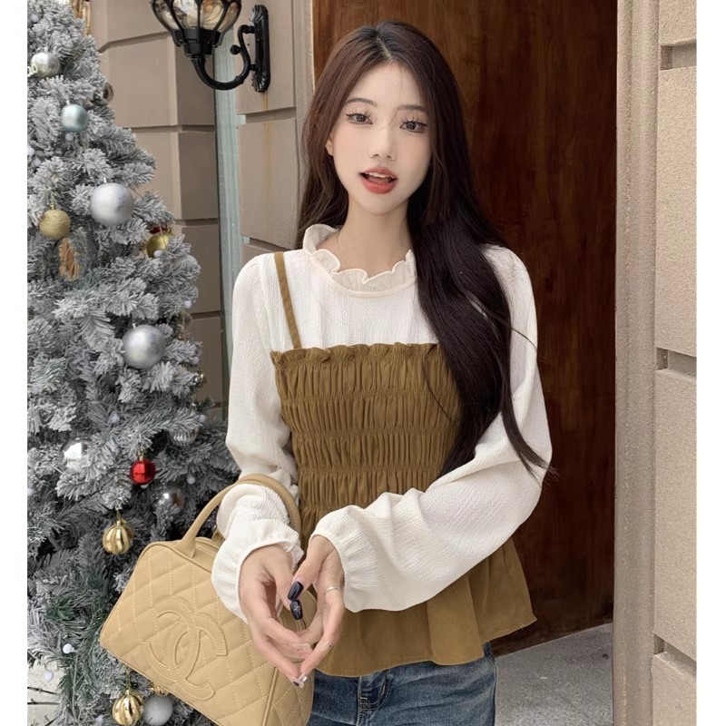 别致褶皱收腰木耳边短款 假两件撞色拼接泡泡袖 法式 女秋季 上衣 衬衫