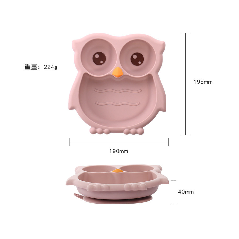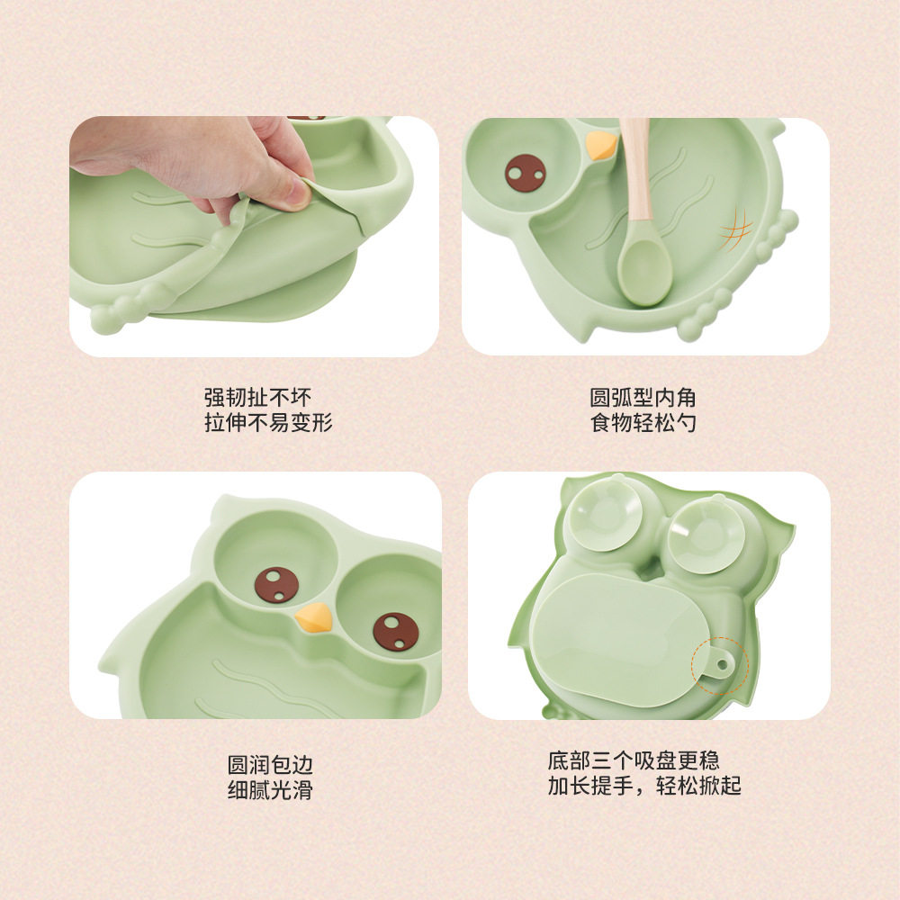 宝宝硅胶分格卡通吸盘餐盘一体式 辅食婴儿铂金硅胶猫头鹰餐具防摔