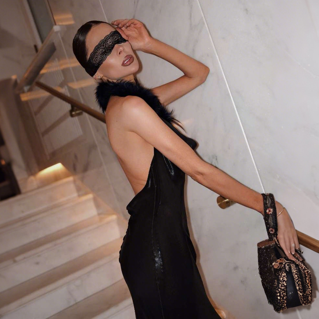 SylCue冷艳御姐风时尚 百搭拖地晚礼服长裙 毛毛拼接挂脖连衣裙修身