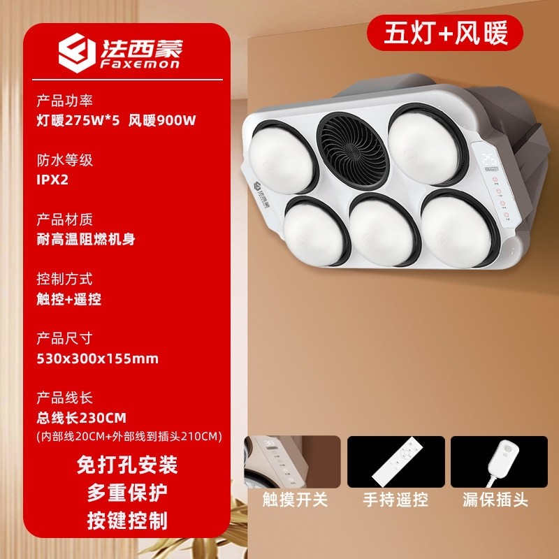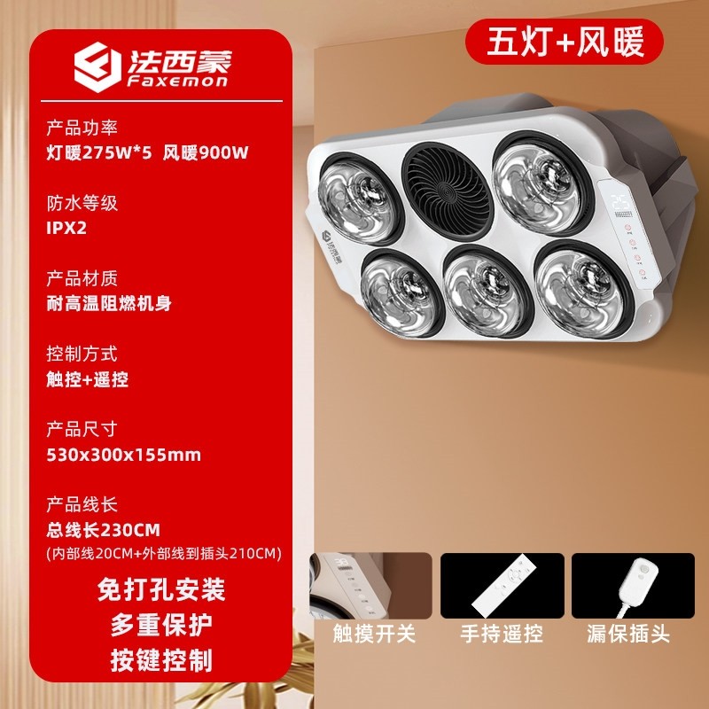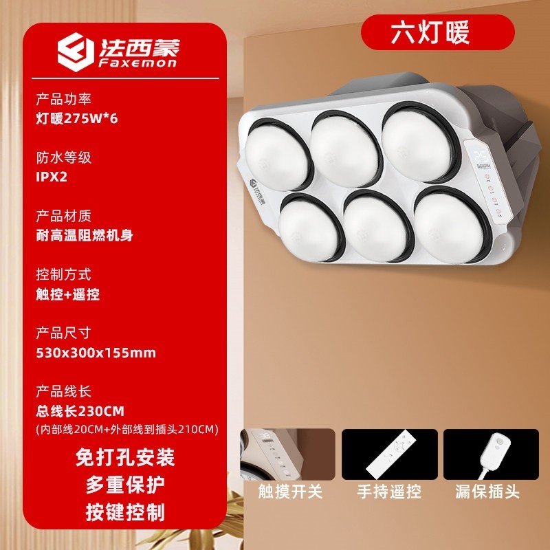 法西蒙六灯浴霸挂墙式 灯暖即热免打孔风暖取暖器壁挂 卫生间浴室式