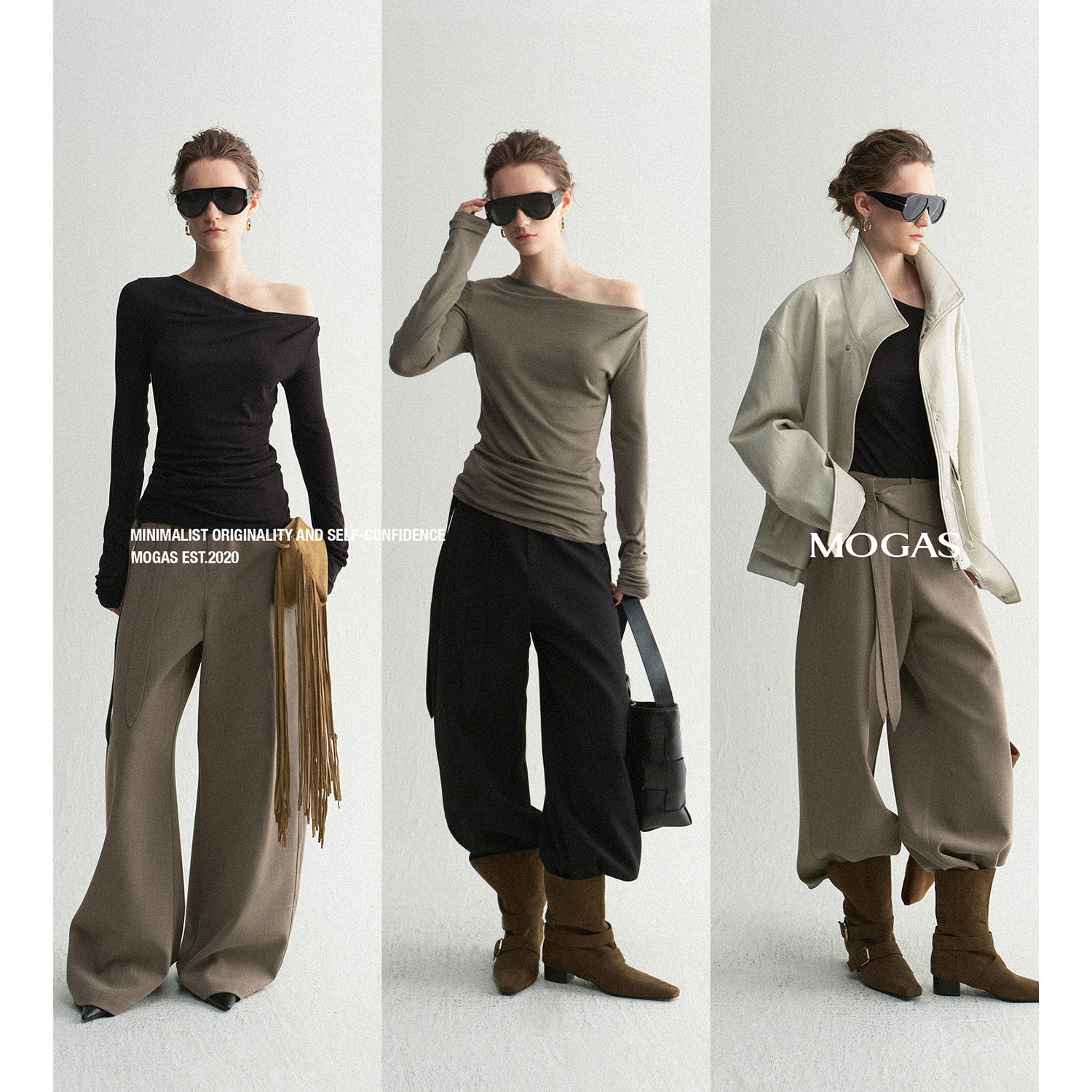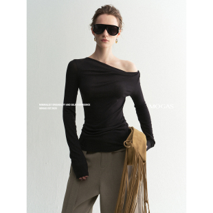 T恤上衣 Mogas优雅延续重磅莱赛尔羊毛混纺斜肩一字领长袖 现货